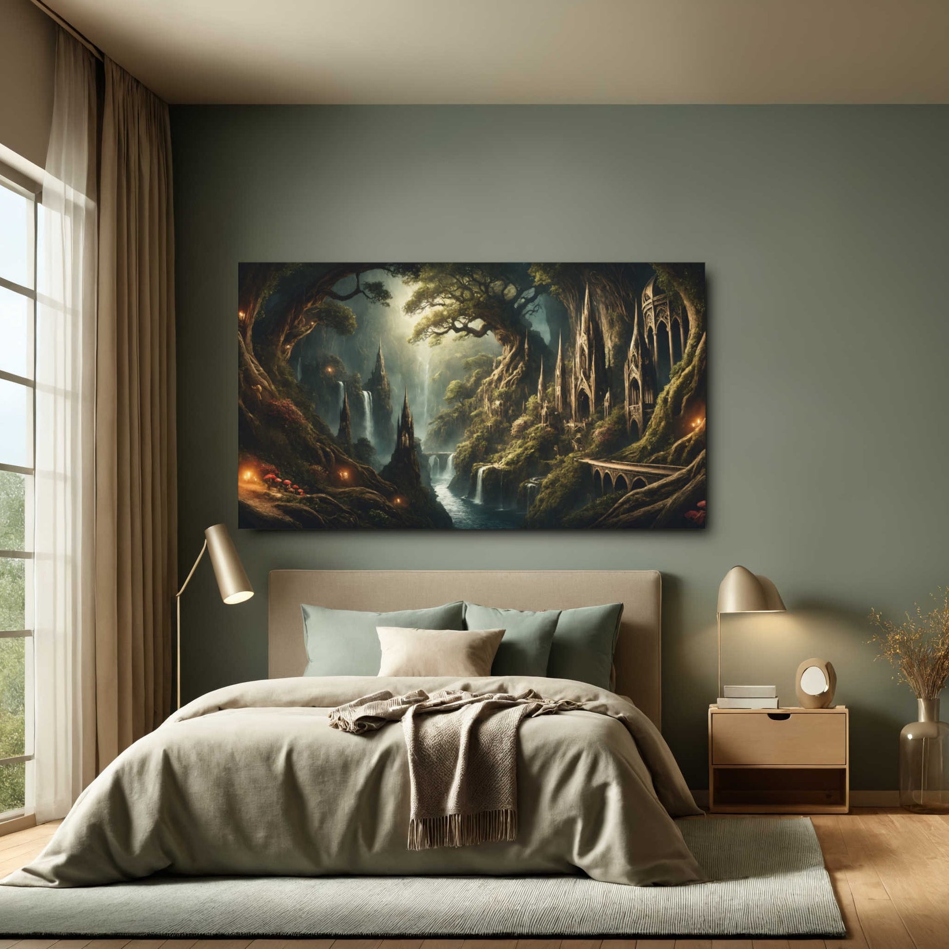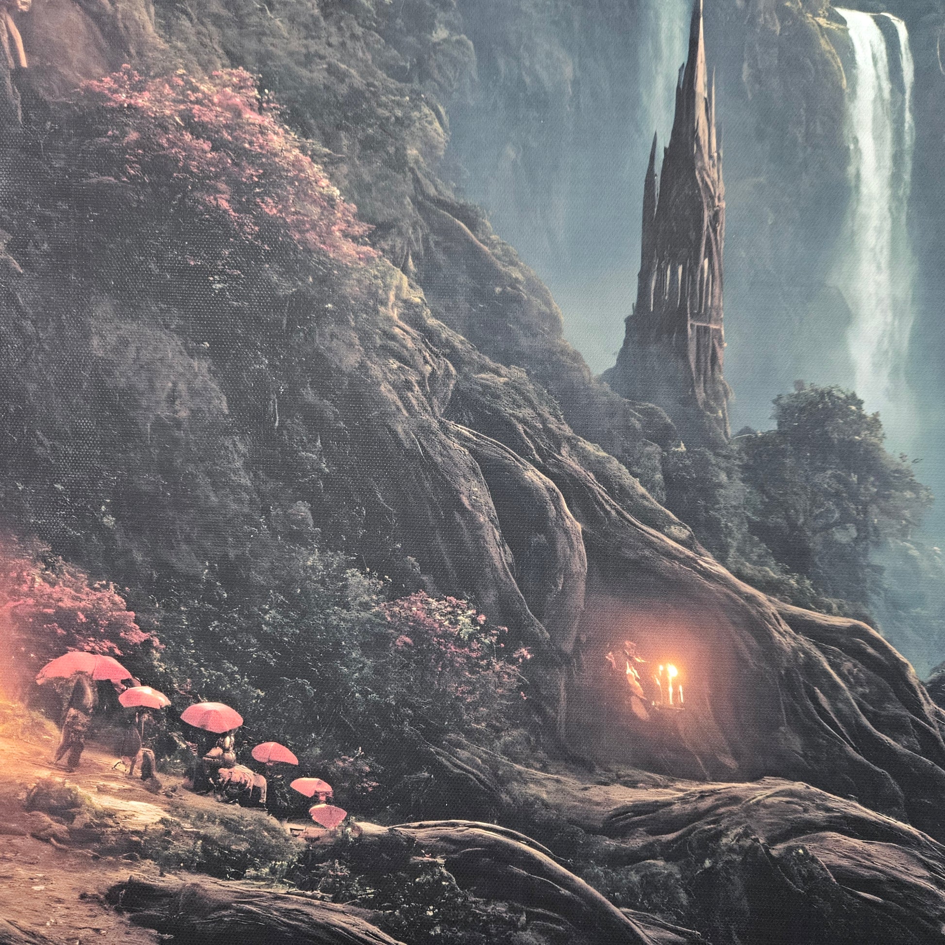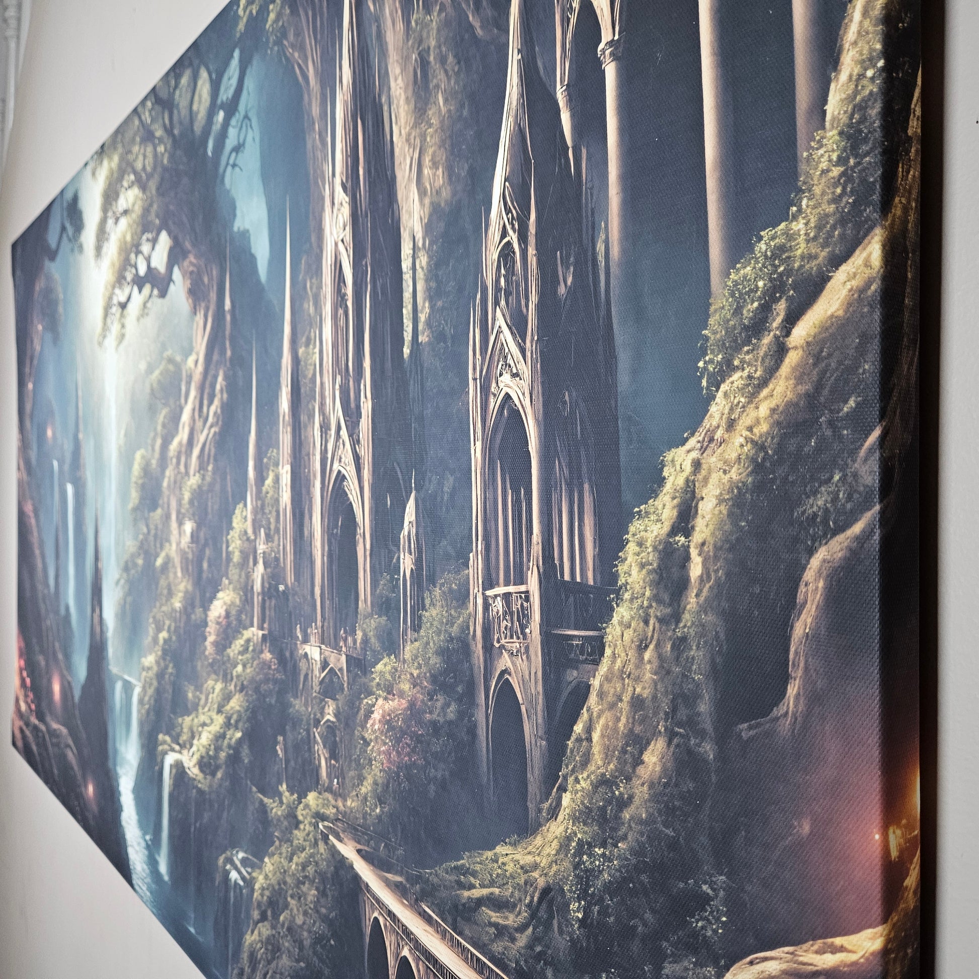 Soft golden light filters through immense trees, revealing an enchanted world filled with serenity, mystery, and quiet magic. This artwork offers a stunning blend of architecture, nature, and atmosphere — perfect for fantasy art fans and collectors who want something truly transportive.