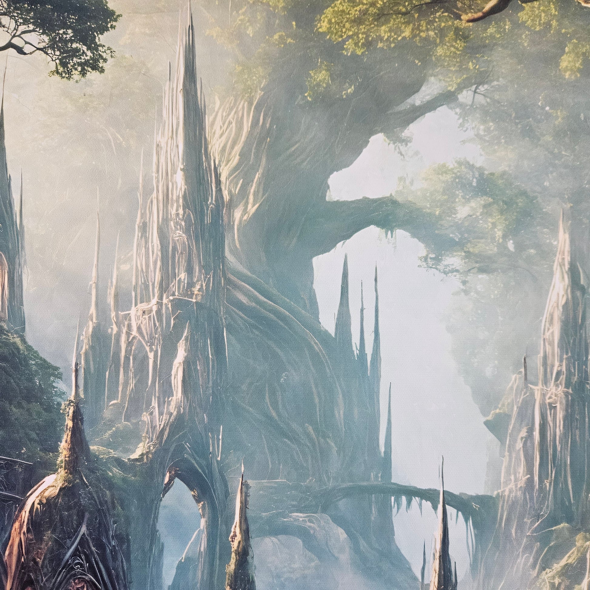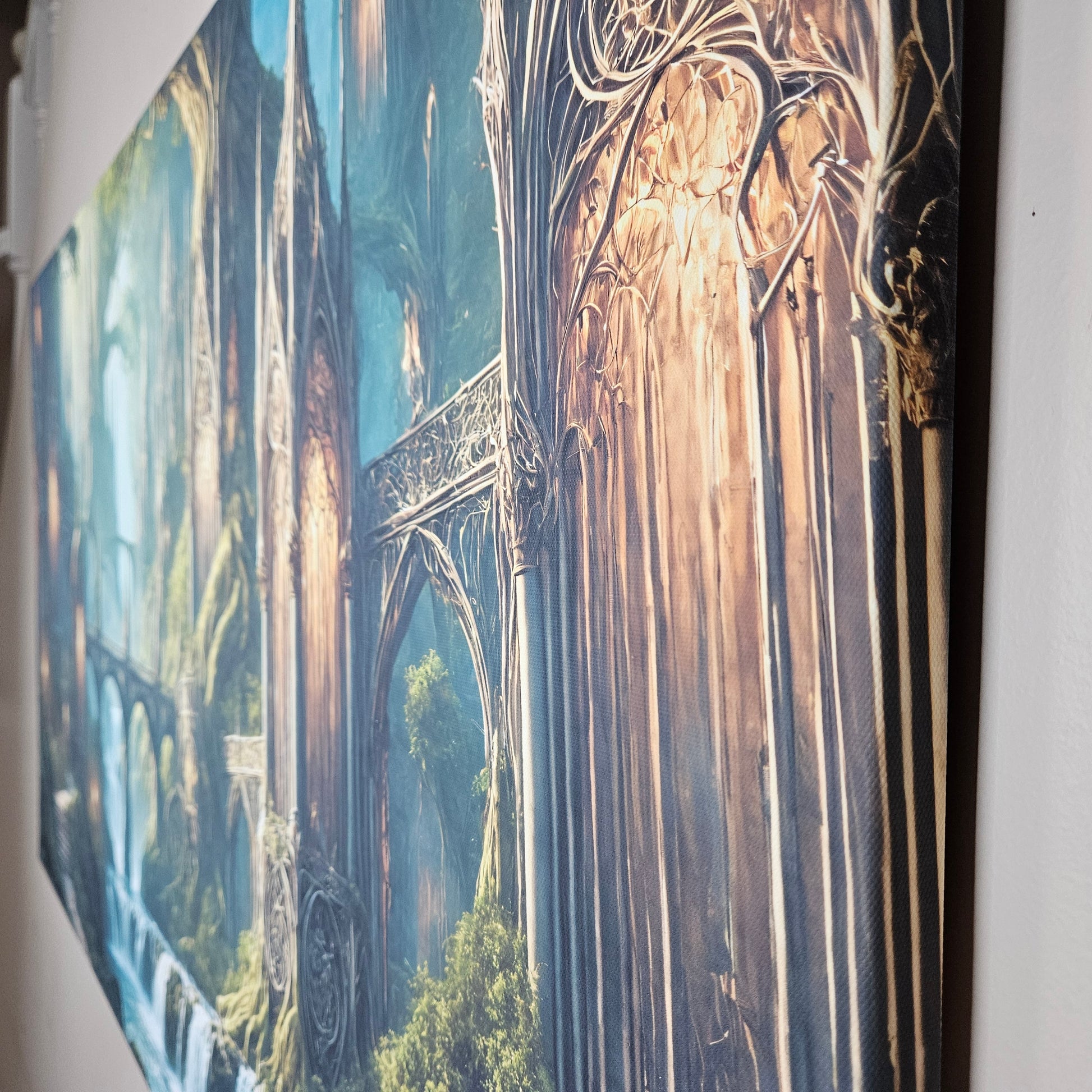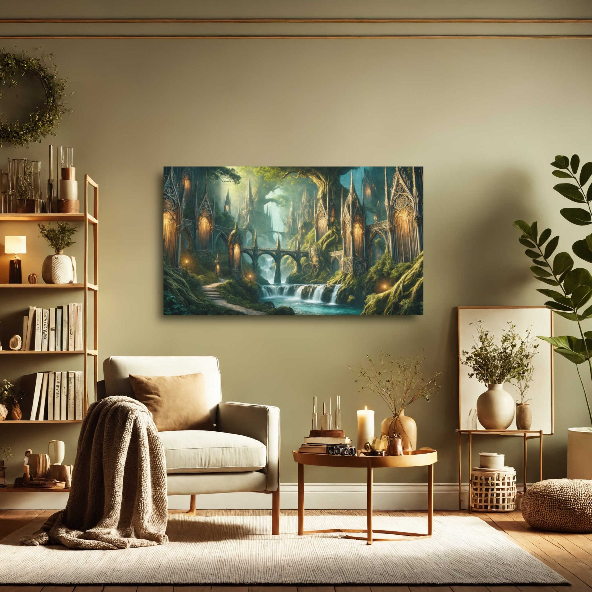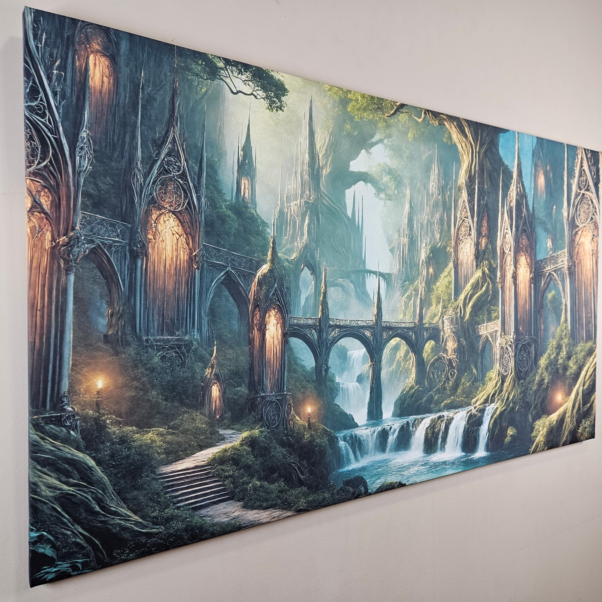 Warm golden lanterns illuminate moss-covered roots and carved arches, guiding the eye toward the layered waterfalls that define this serene elven kingdom. Perfect for collectors who crave atmospheric fantasy art that transforms a room into a world of wonder.
