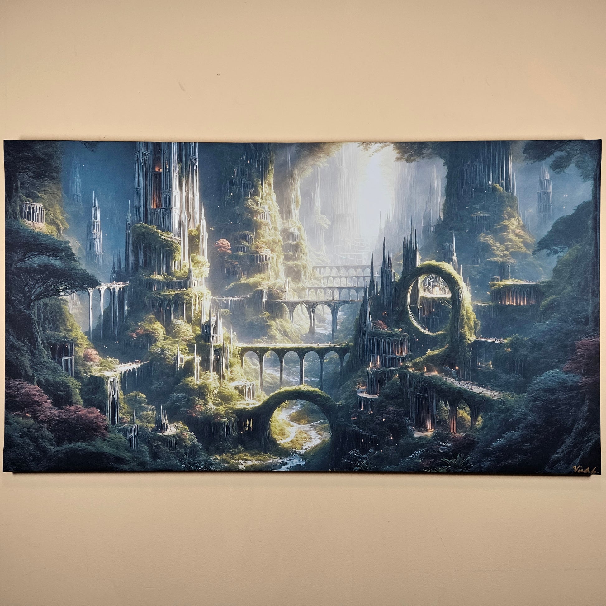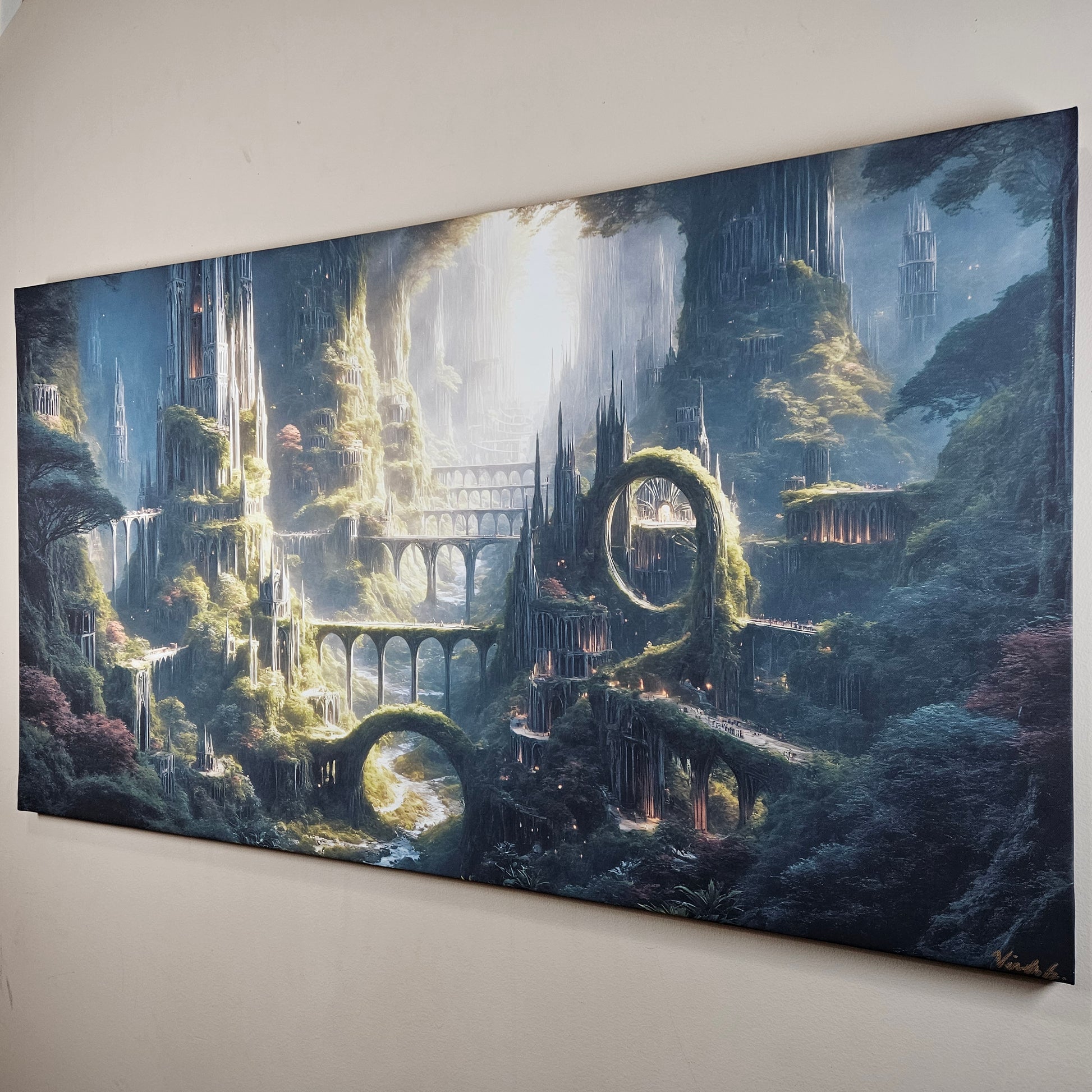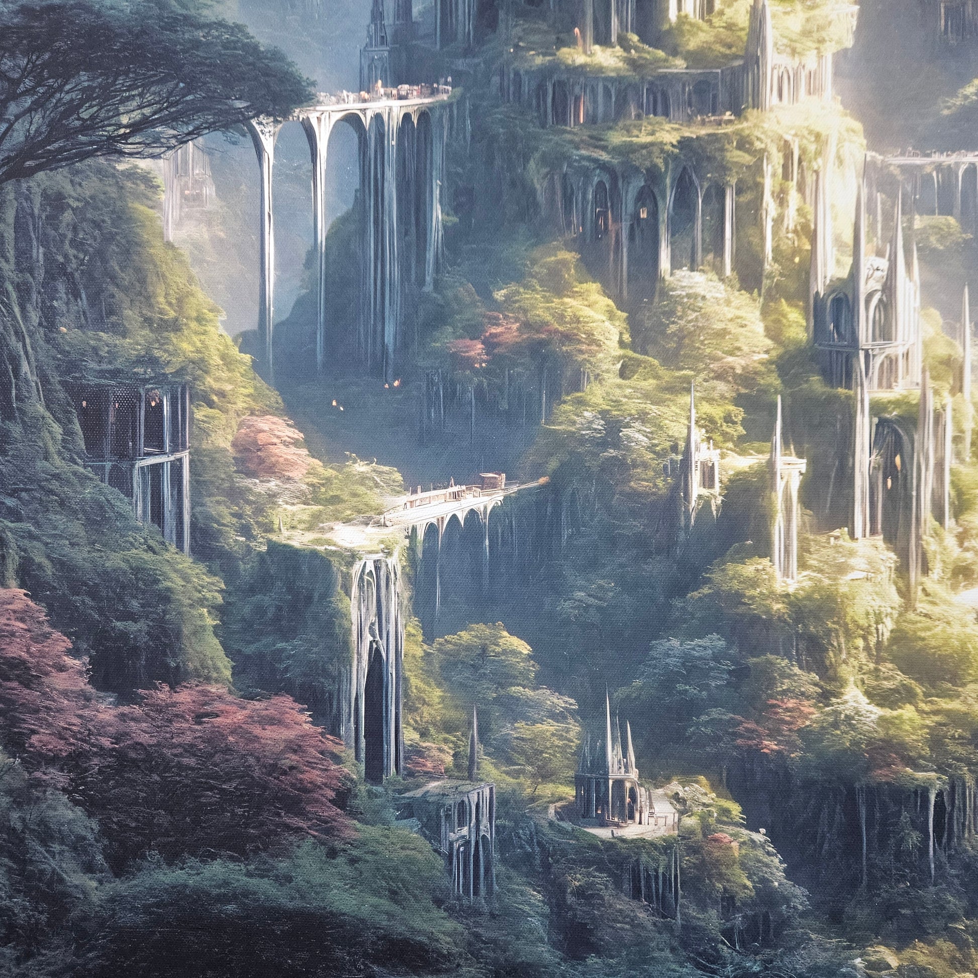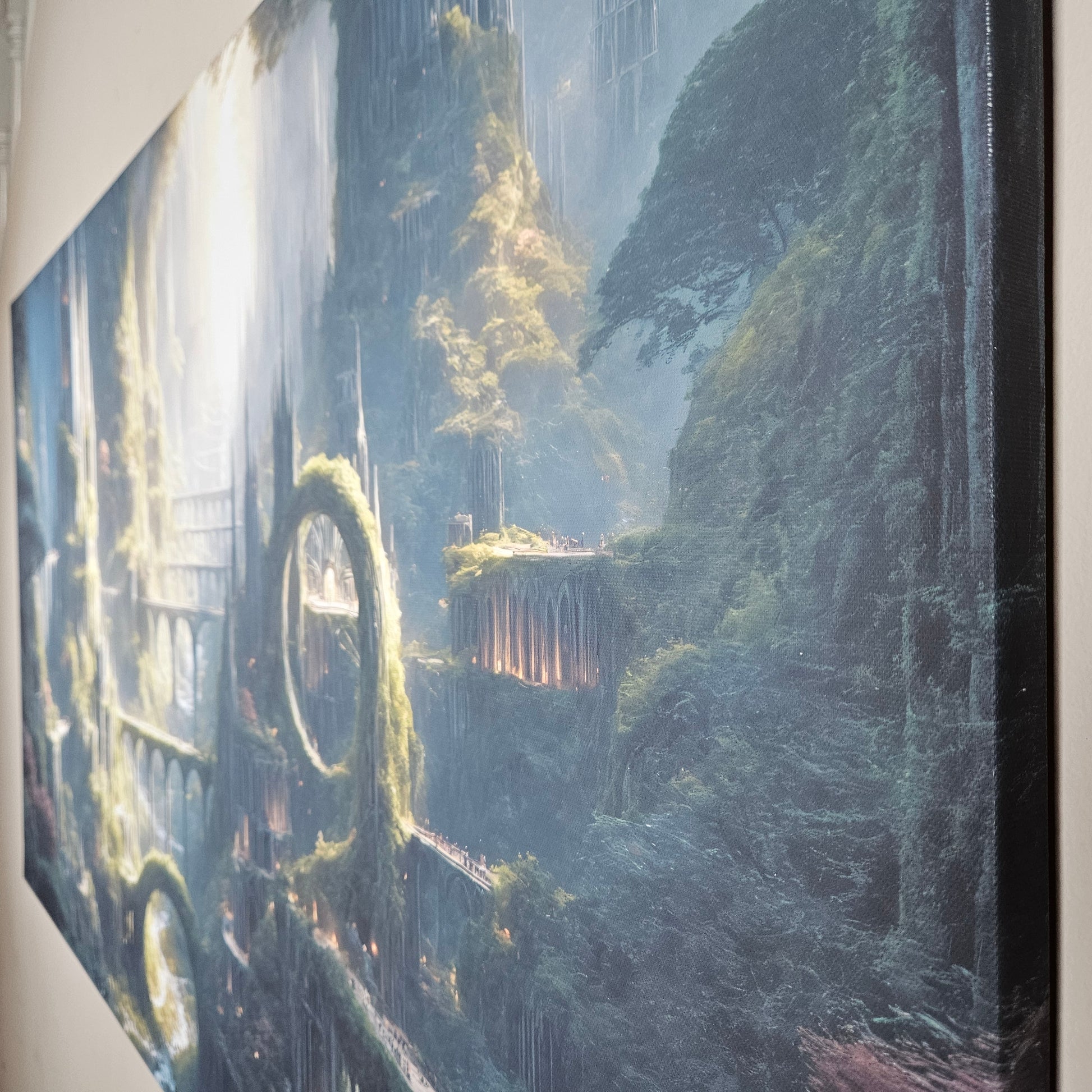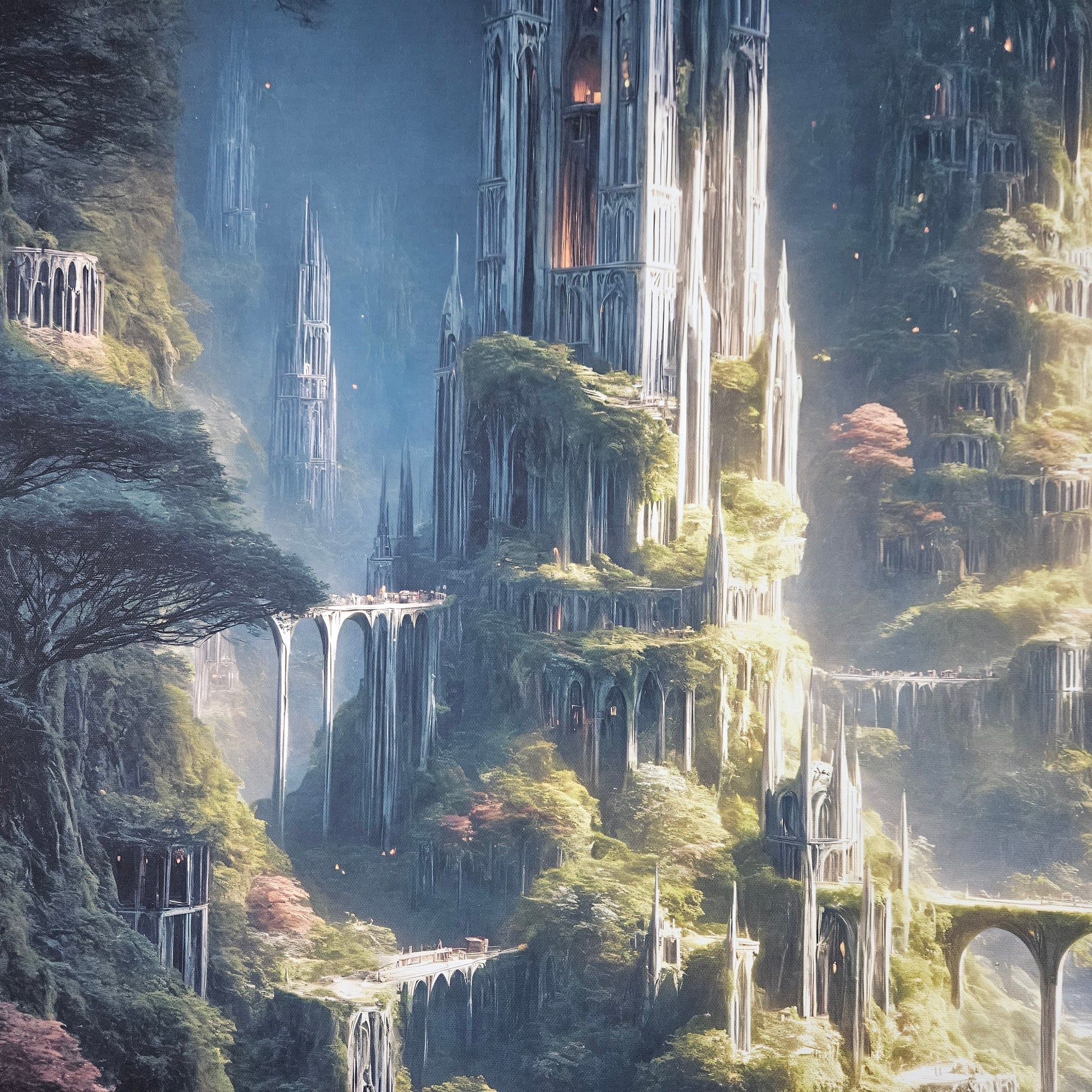 Delicate spires emerge from lush overgrowth, and winding pathways guide the eye through a sweeping landscape filled with mystery and awe. Perfect for collectors who love intricate world-building, luminous atmosphere, and fantasy environments that ignite the imagination.