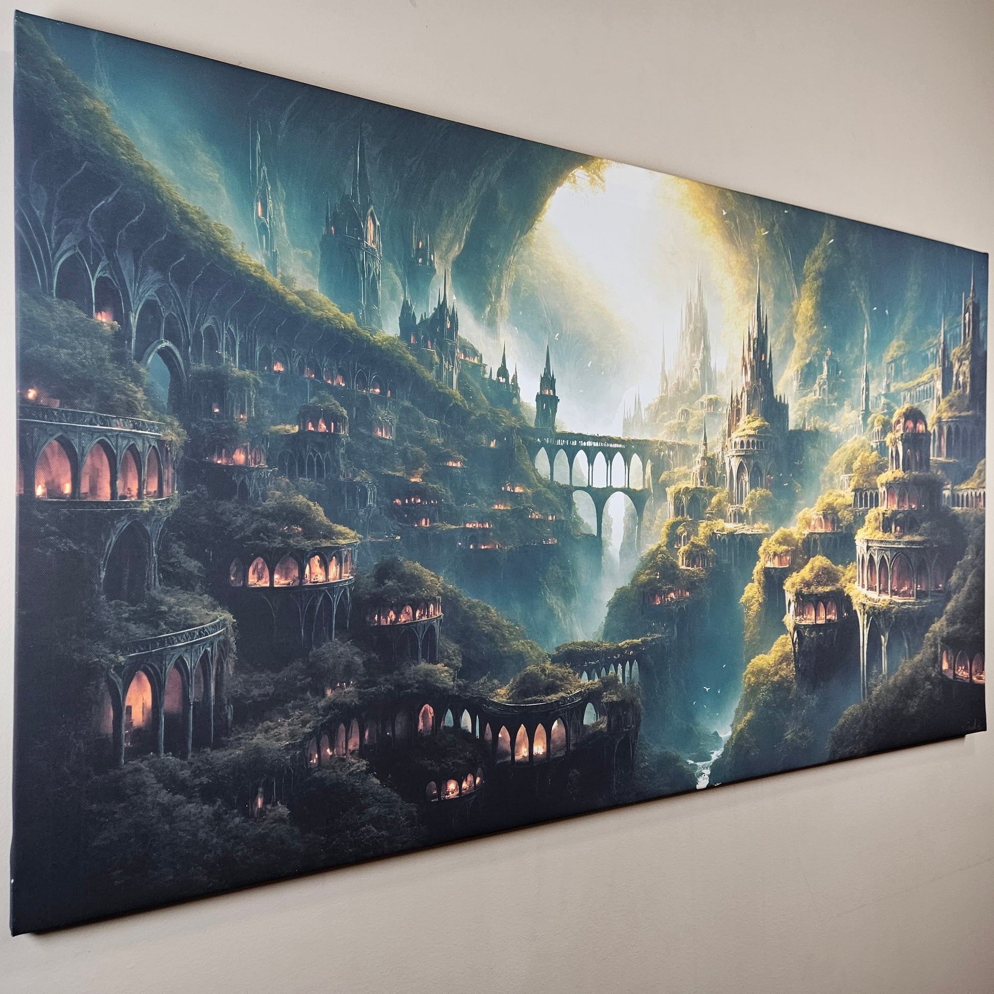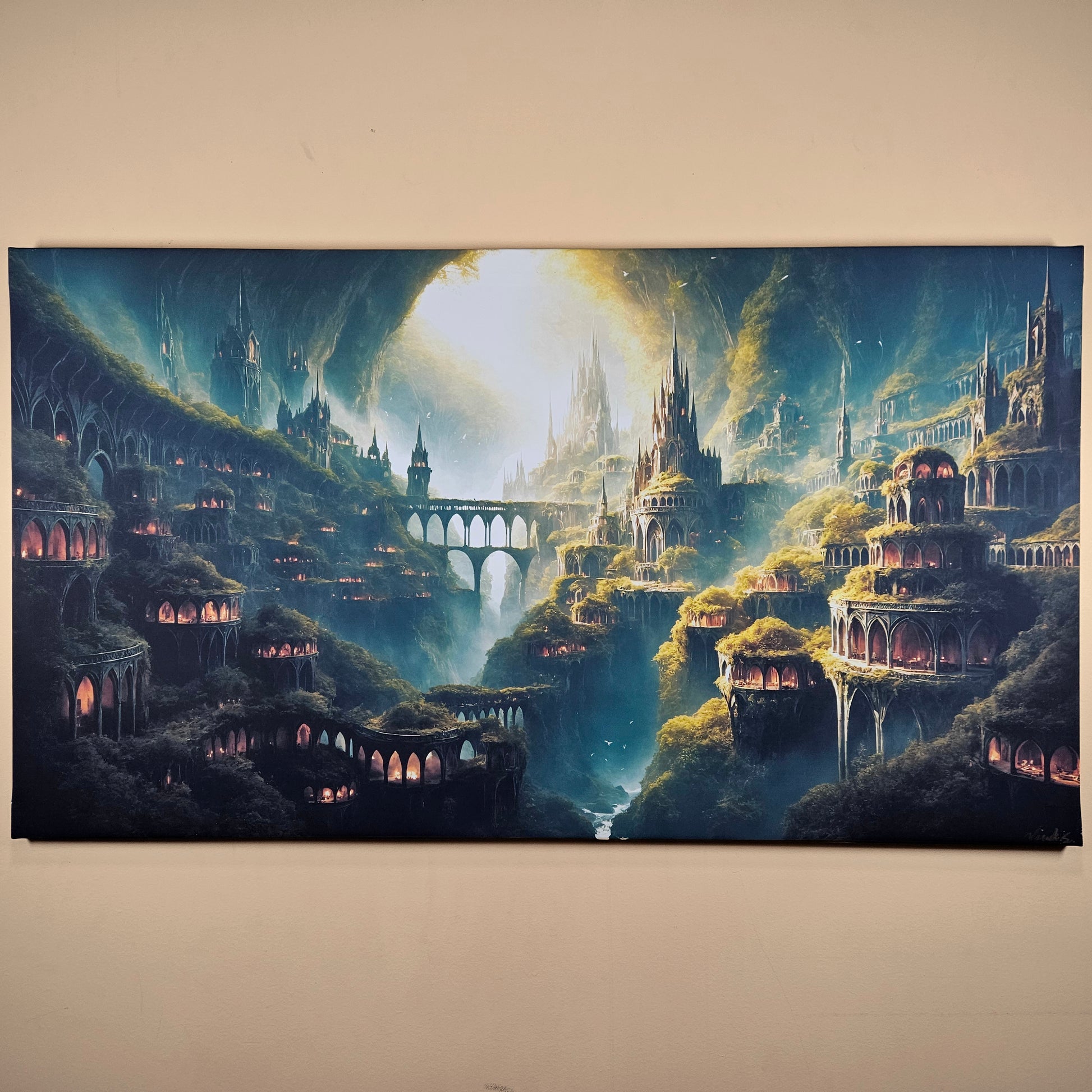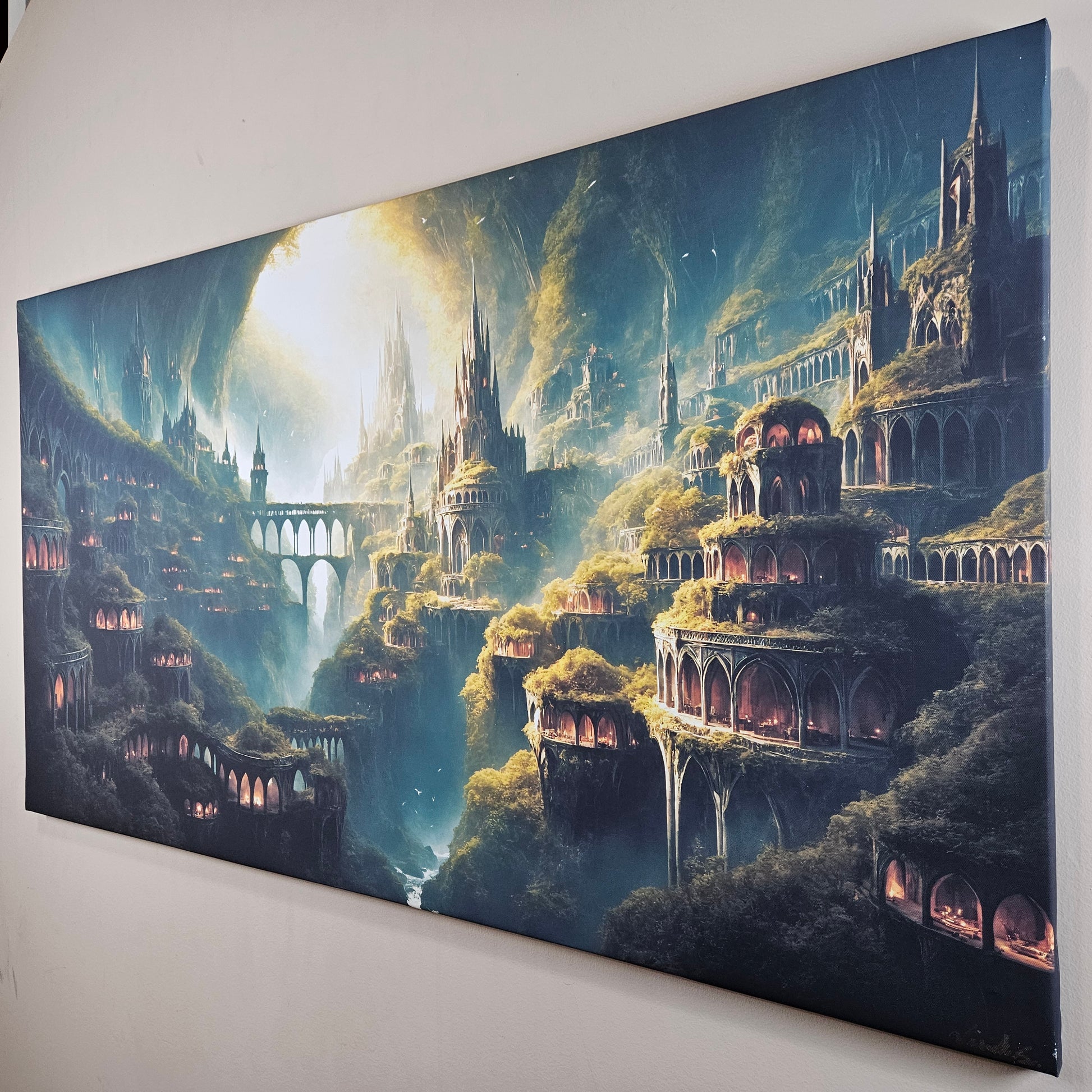 This artwork blends grand world-building with luminous atmosphere, offering a breathtaking sense of scale and wonder. Perfect for collectors who love epic fantasy cities, glowing environments, and art that feels alive with story.
