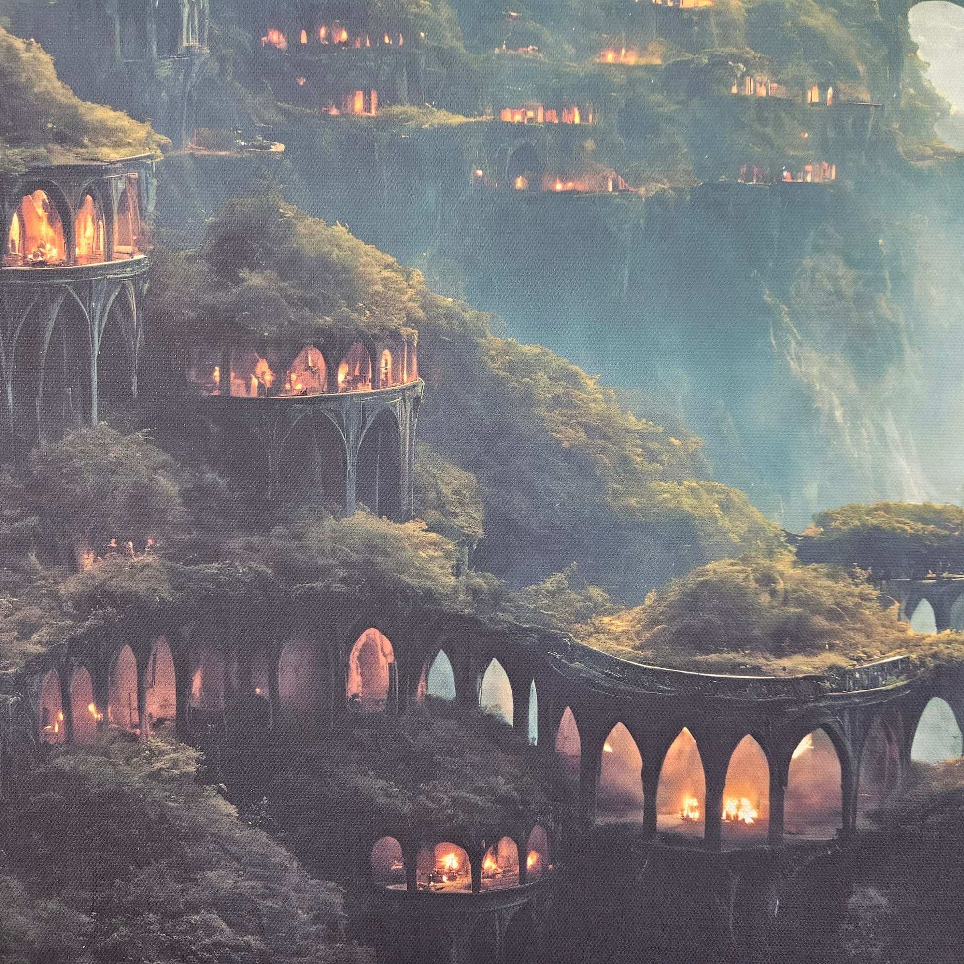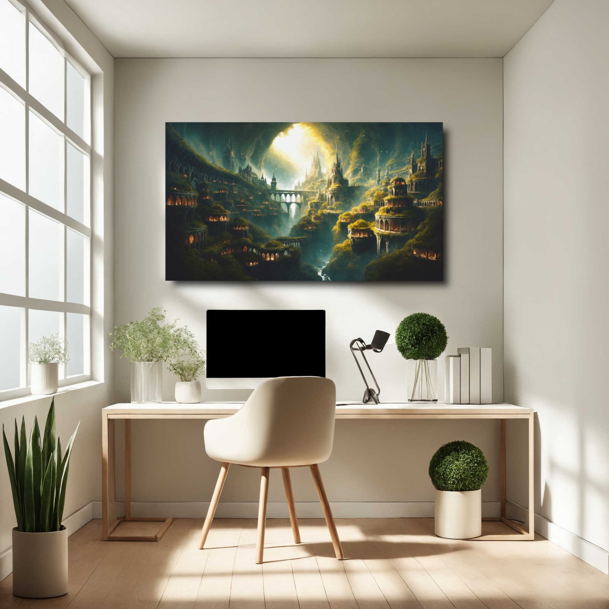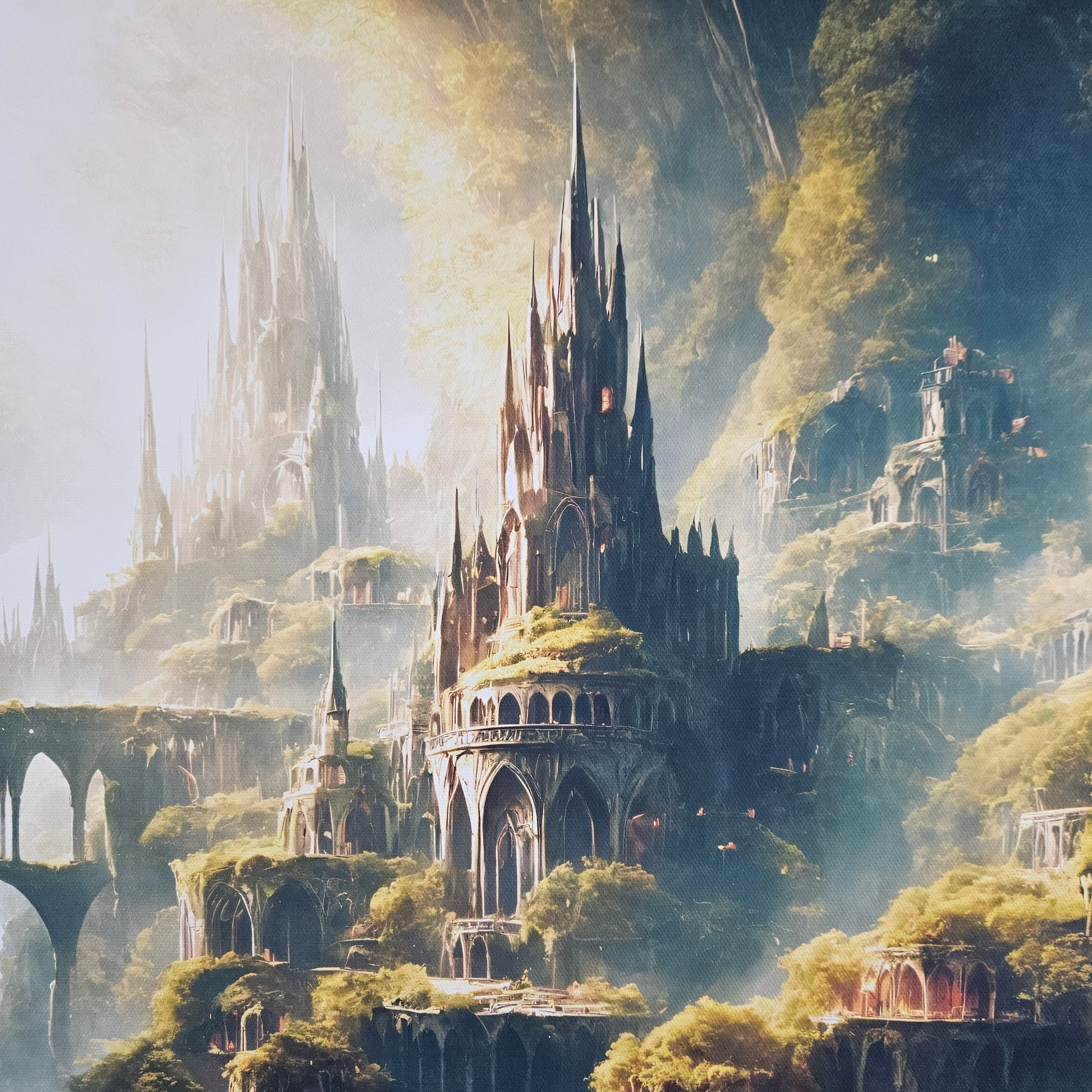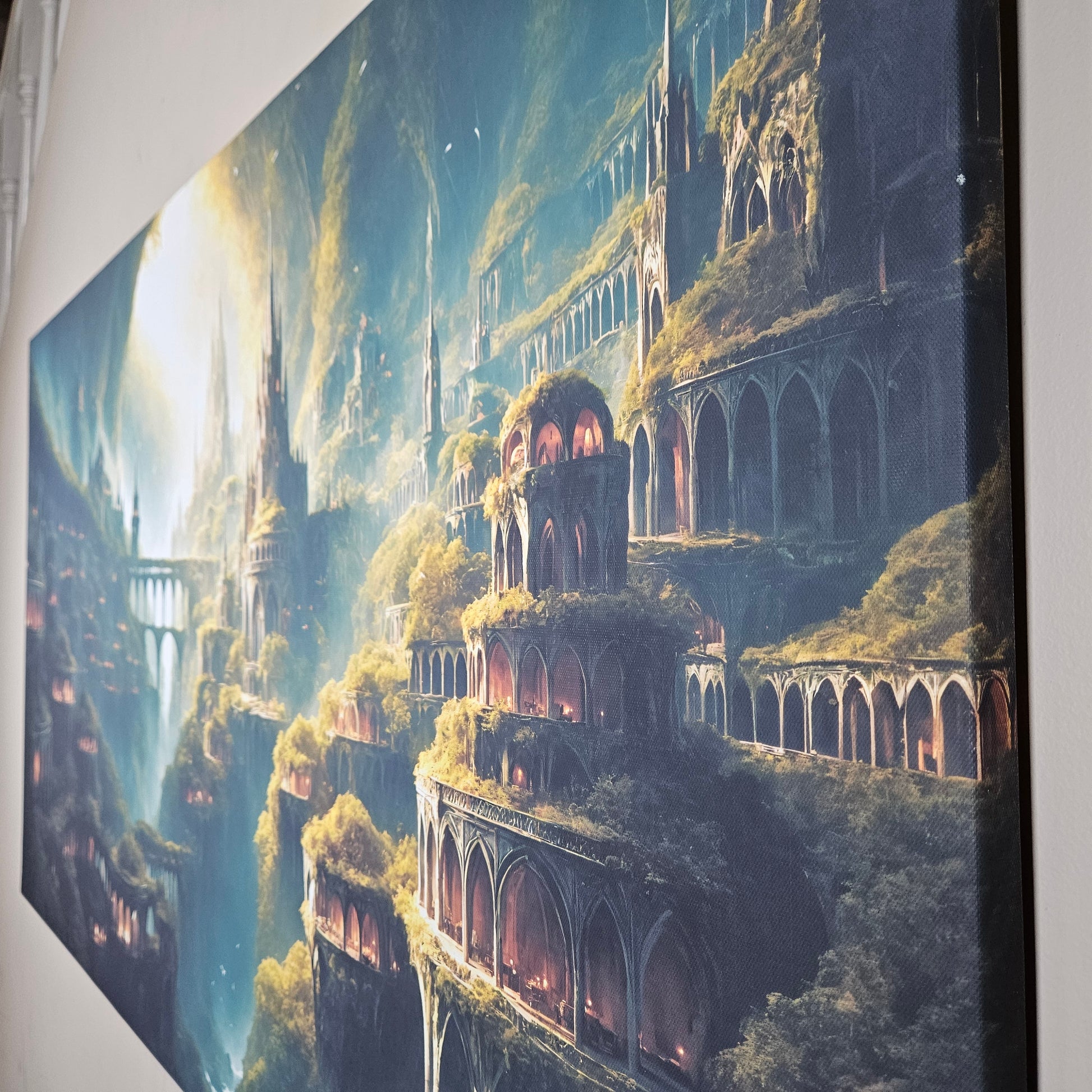 This artwork blends grand world-building with luminous atmosphere, offering a breathtaking sense of scale and wonder. Perfect for collectors who love epic fantasy cities, glowing environments, and art that feels alive with story.