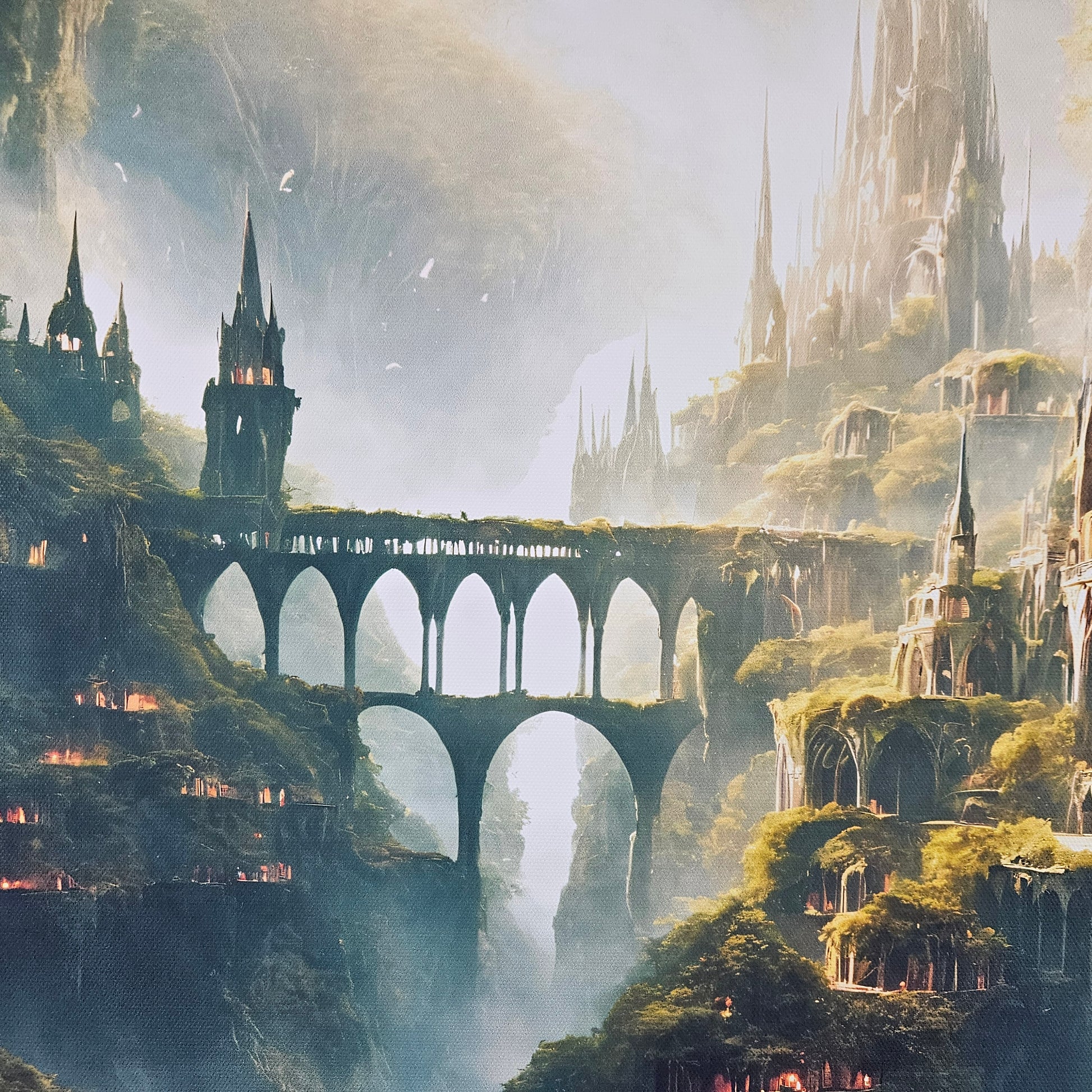 Explore Mossgarde Ascendant, an immense elven metropolis rising from the depths of a moss-covered canyon. Thousands of glowing terraces curve along ancient stone walls, while graceful bridges connect soaring towers bathed in golden light. Deep below, a river winds through misty shadows, guiding the eye toward a radiant sky that opens above the city like a celestial beacon.