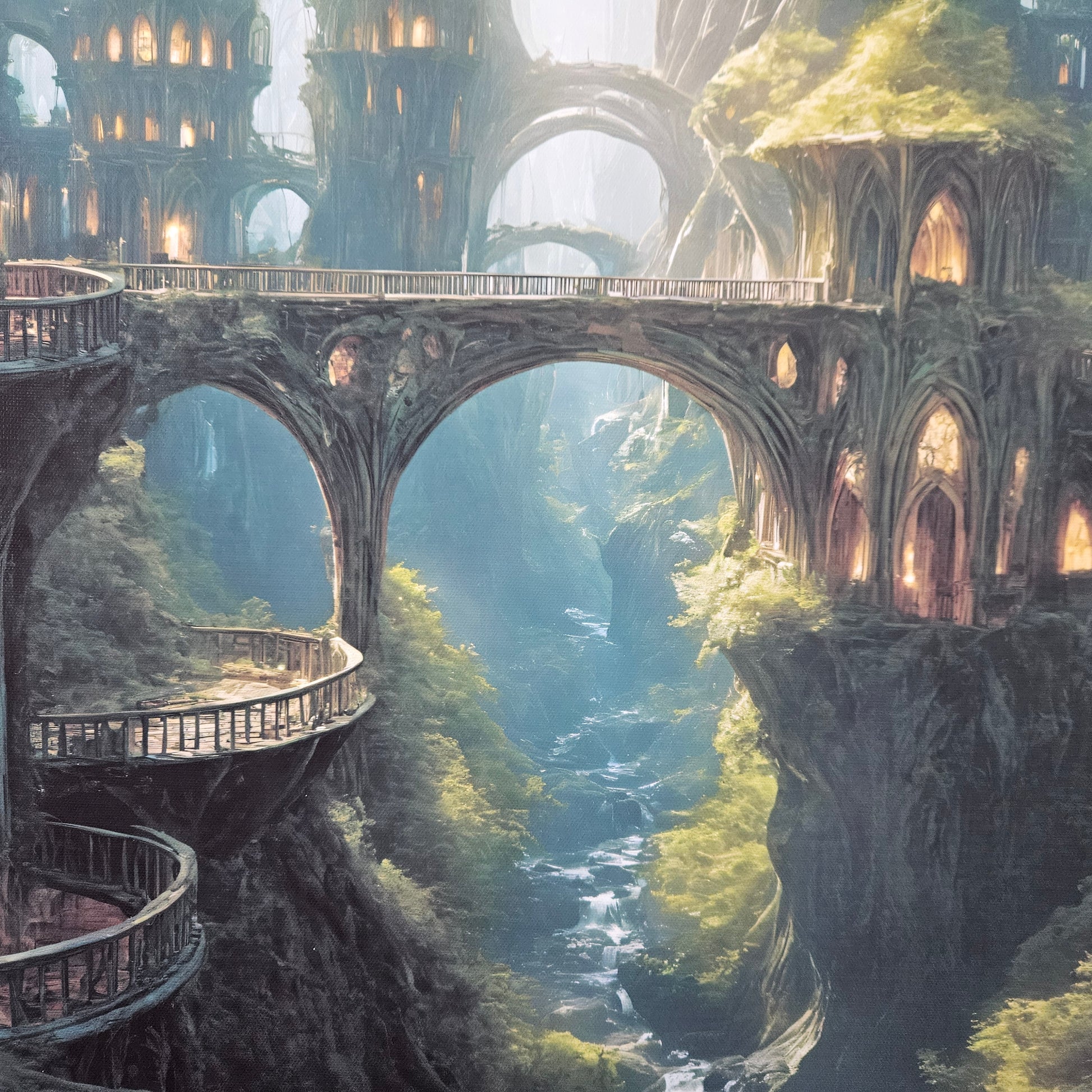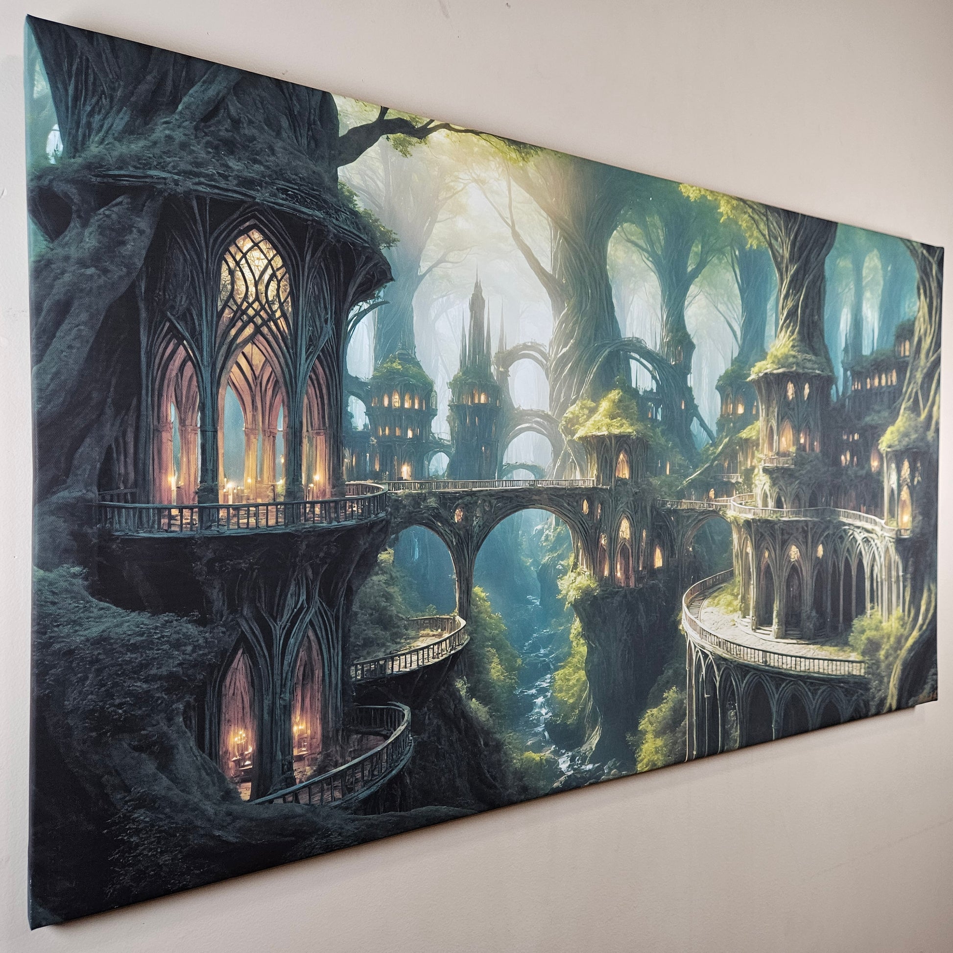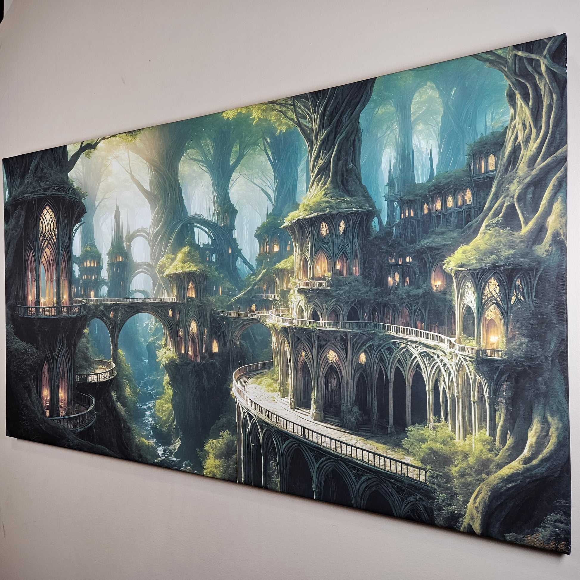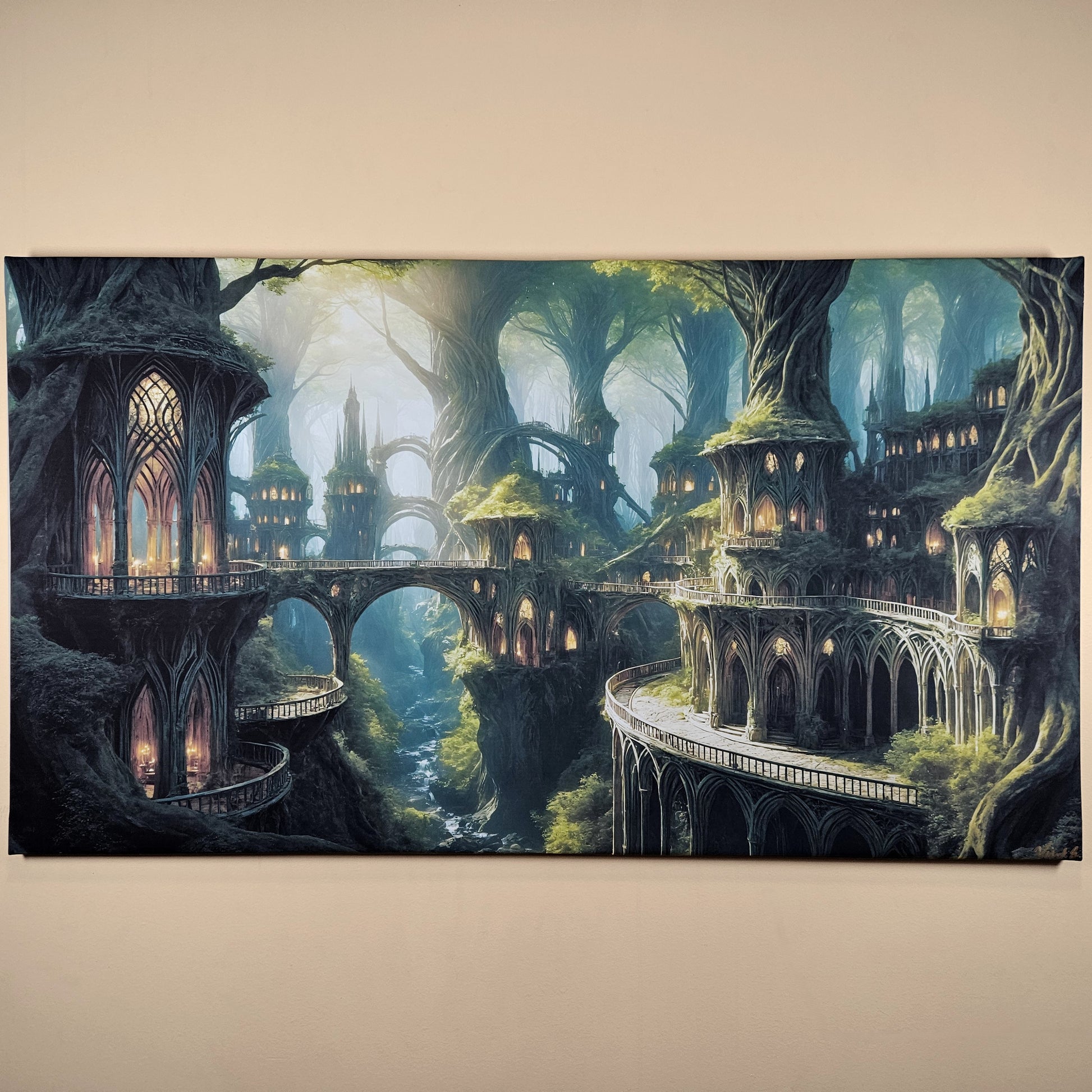 This art piece brings together fantasy and architectural beauty, ideal for anyone drawn to nature, elven mythology, or deeply peaceful interior spaces. A perfect centerpiece for a home office, reading room, or meditative space.