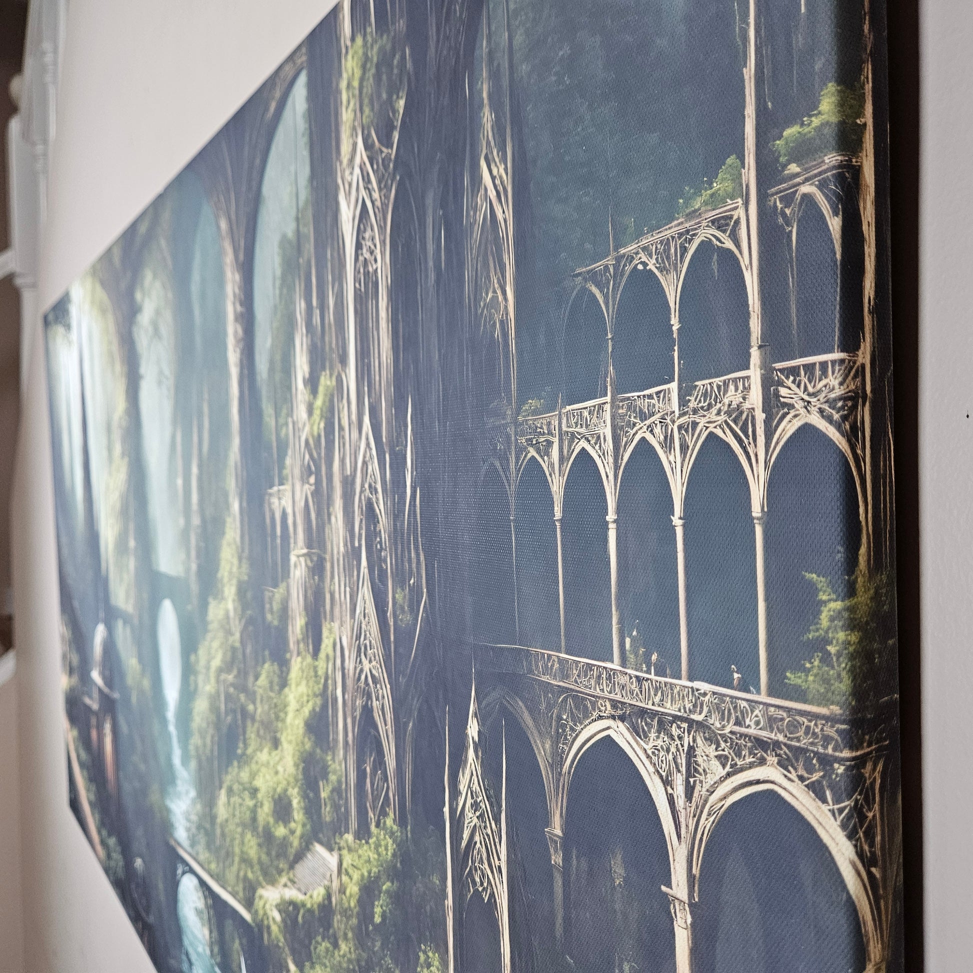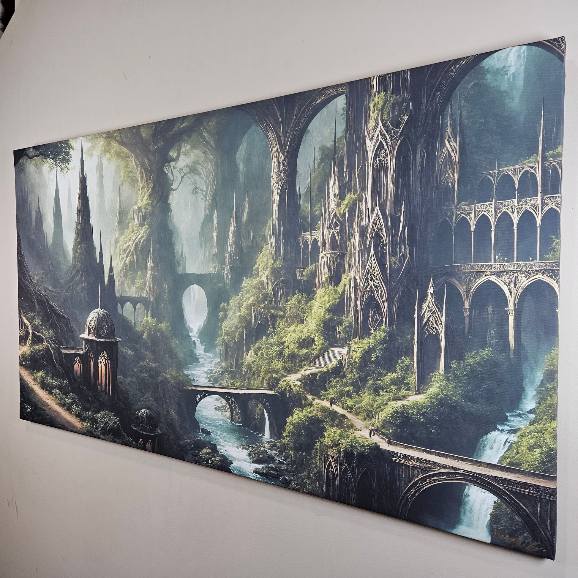 Elegant domes, intricate archways, and vine-wrapped terraces blend seamlessly with colossal trees, creating a world where architecture and nature exist in perfect harmony. This artwork delivers a powerful sense of depth, mystery, and cinematic wonder — ideal for fantasy enthusiasts and collectors seeking a dramatic yet peaceful statement piece.