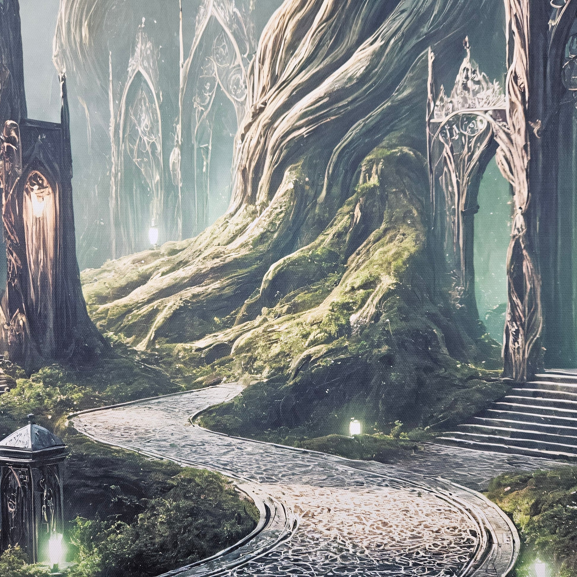 Twisted trunks rise like living sculptures, supporting arches adorned with delicate latticework and glowing lanterns. The gentle curve of the stone path invites you forward, creating a peaceful journey through a world of magic, calm, and timeless elegance.
