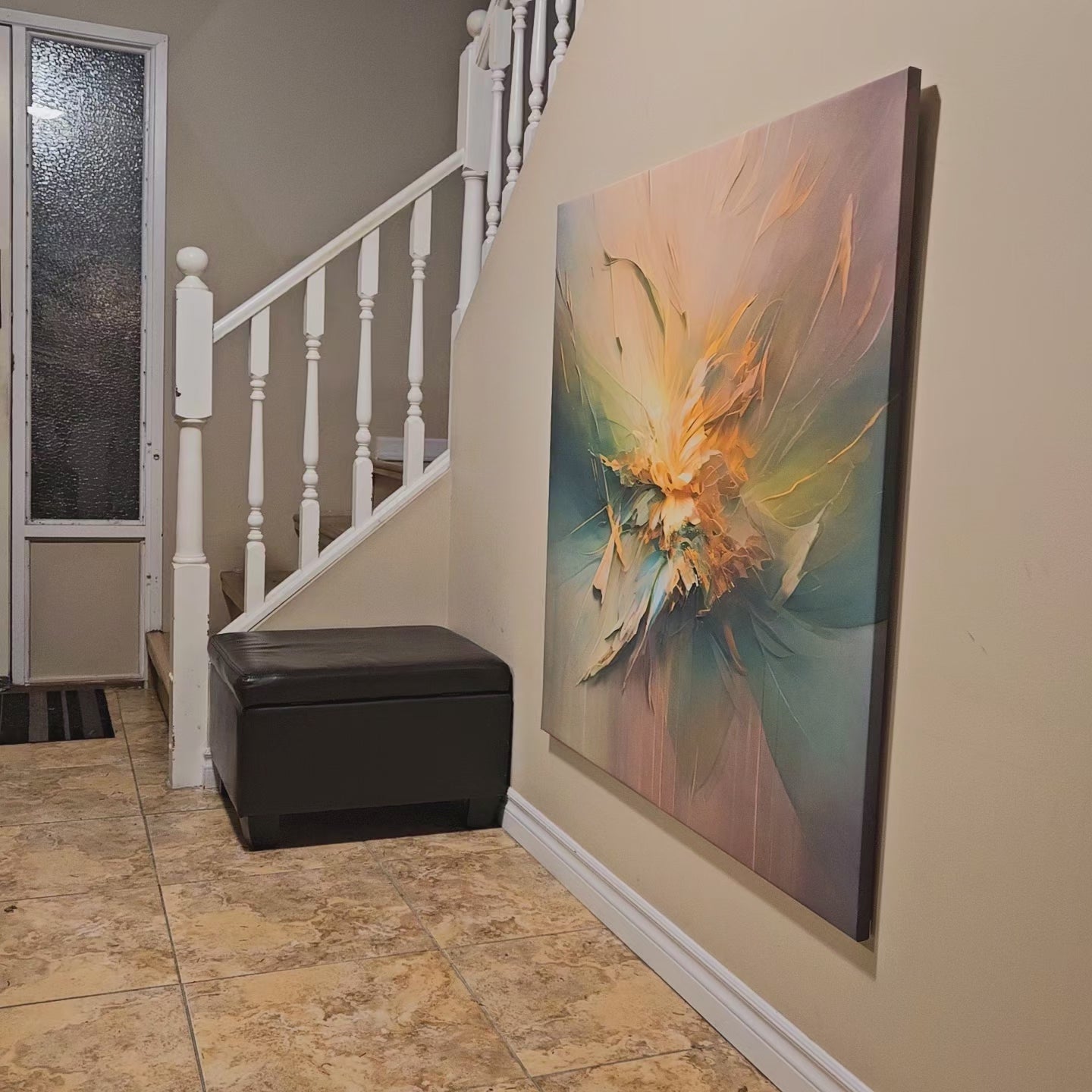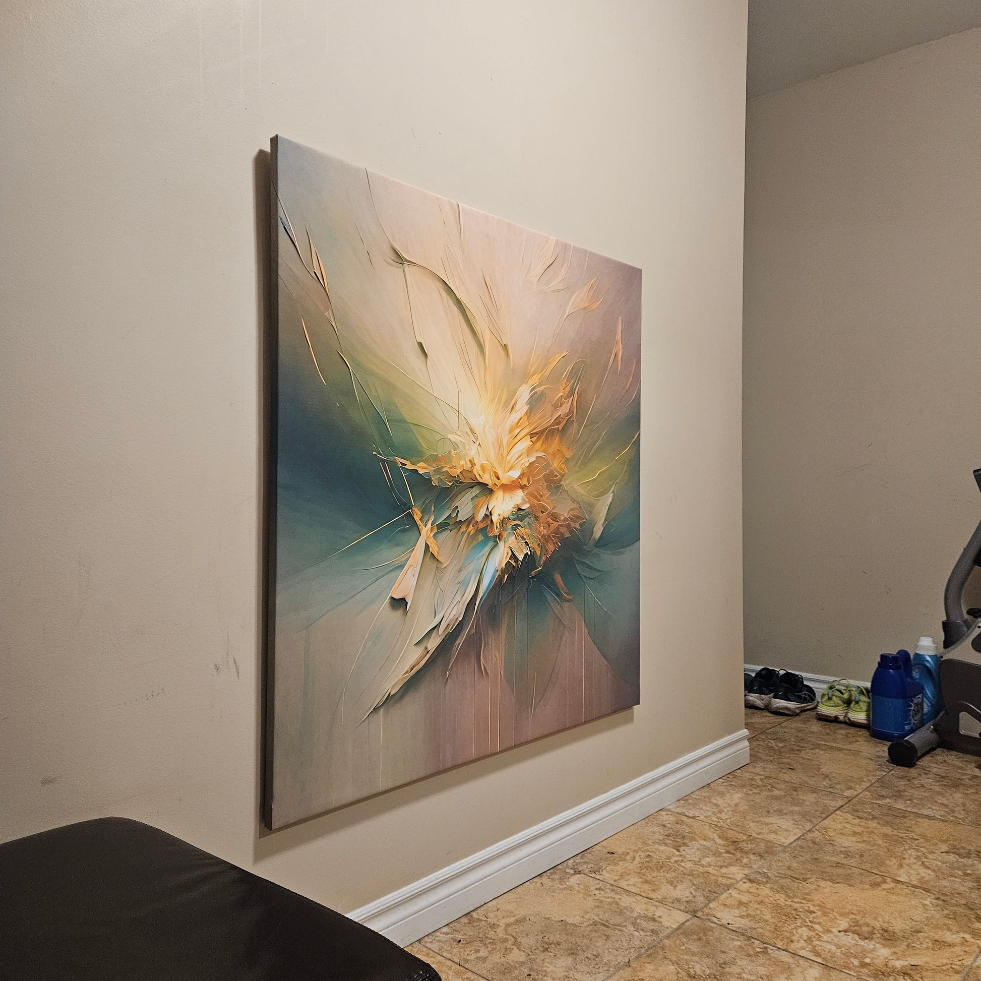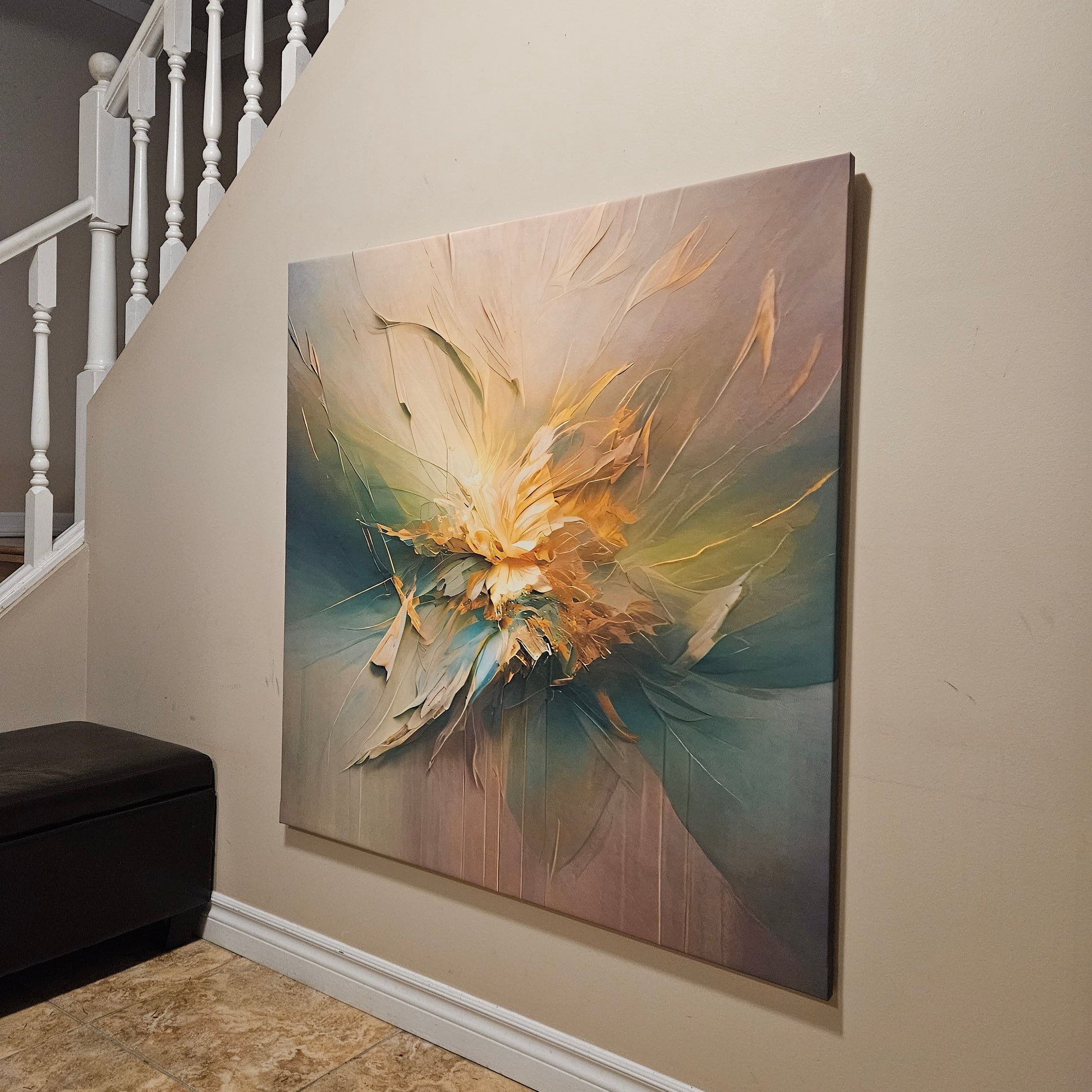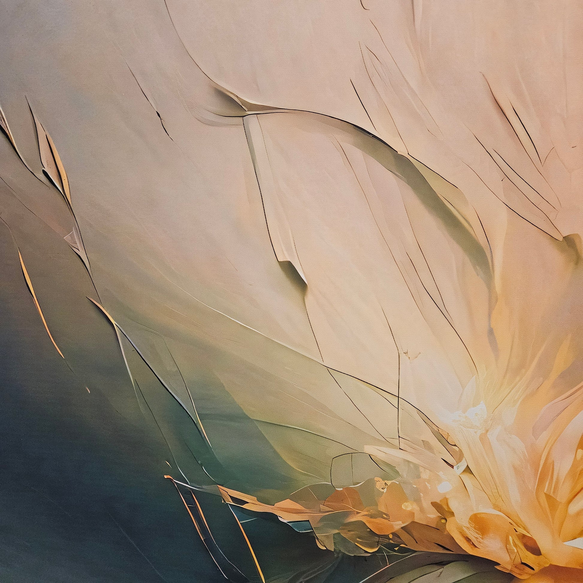 "Emergent Bloom" captures the delicate beauty of a flower in full bloom, rendered in radiant strokes of golden yellow, soft beige, and deep green. This piece exudes a sense of vitality and renewal, making it the perfect addition to any space that seeks to inspire and uplift.