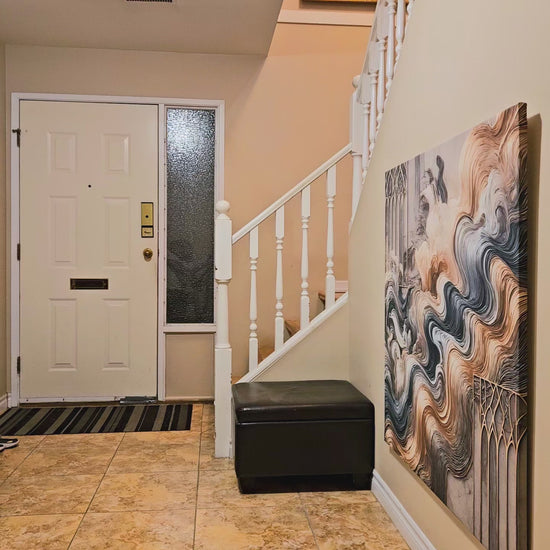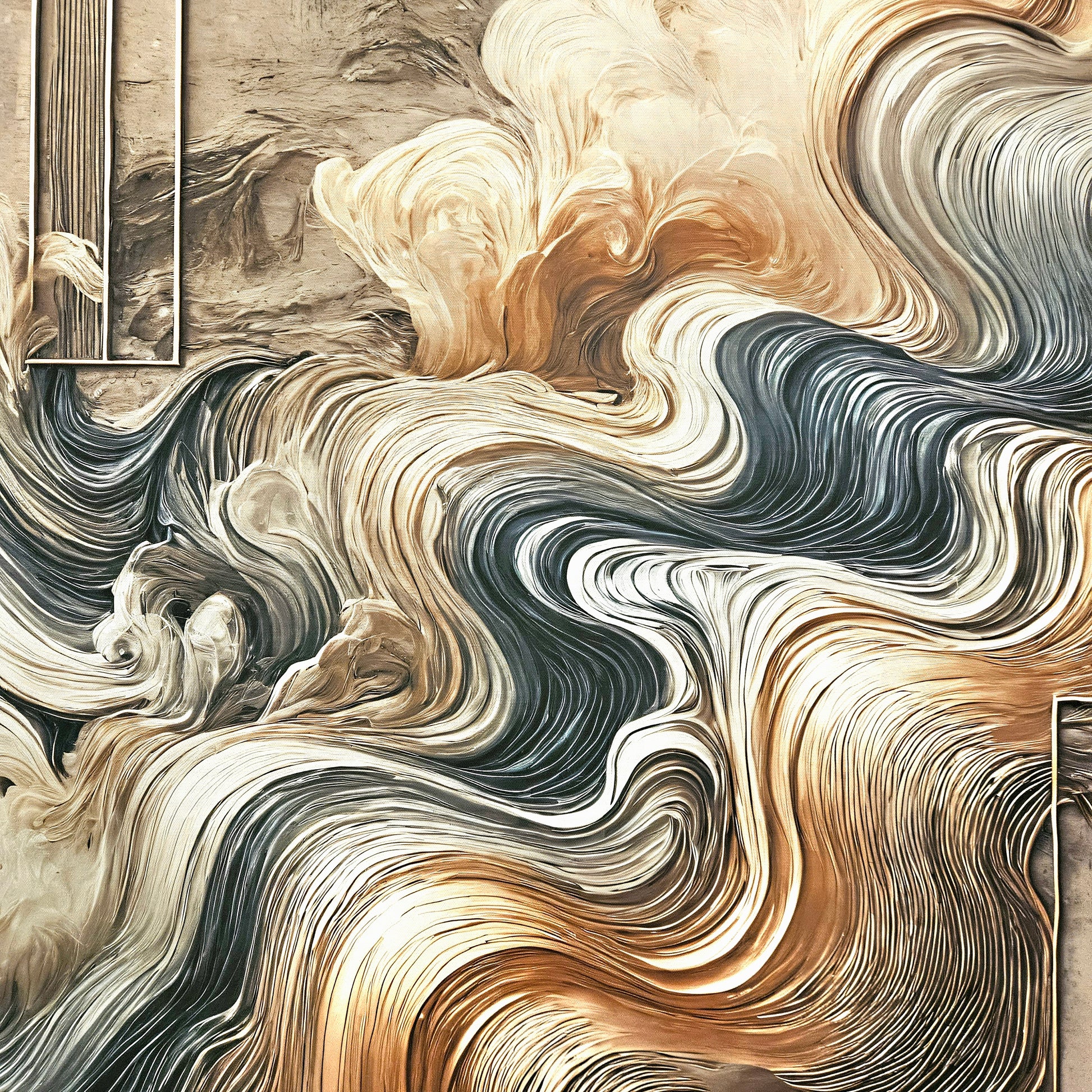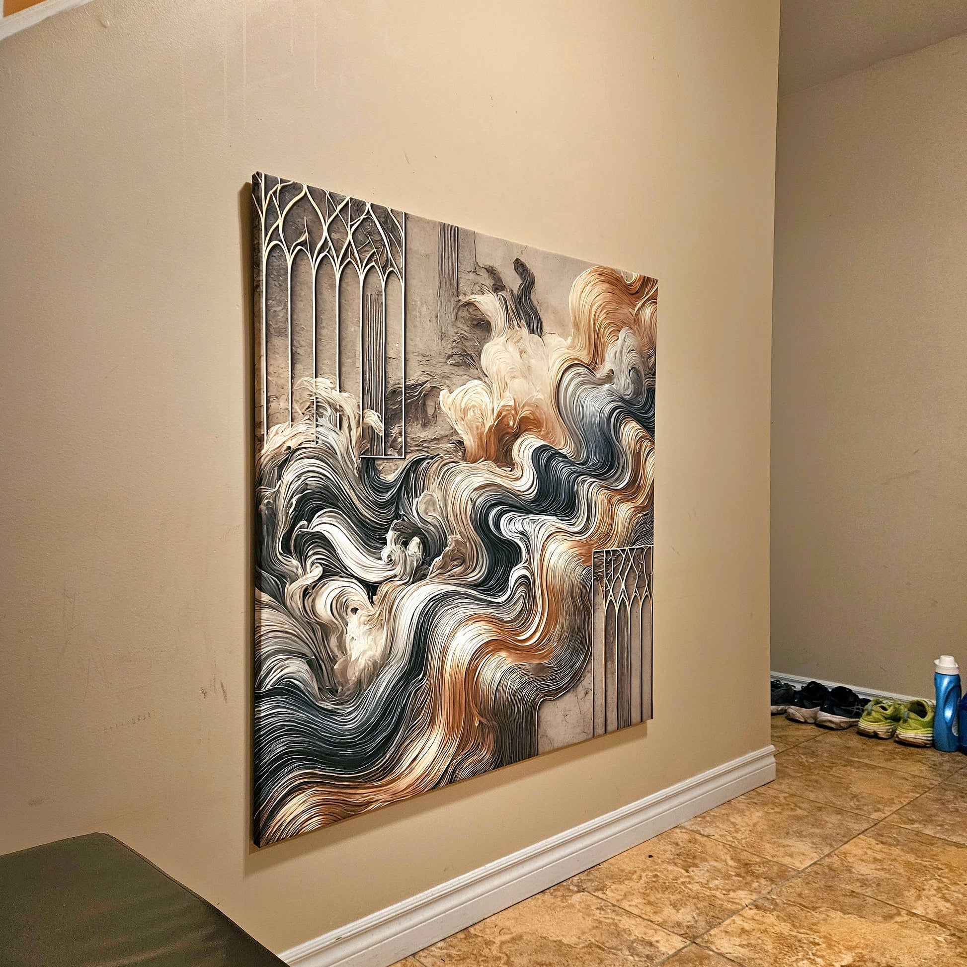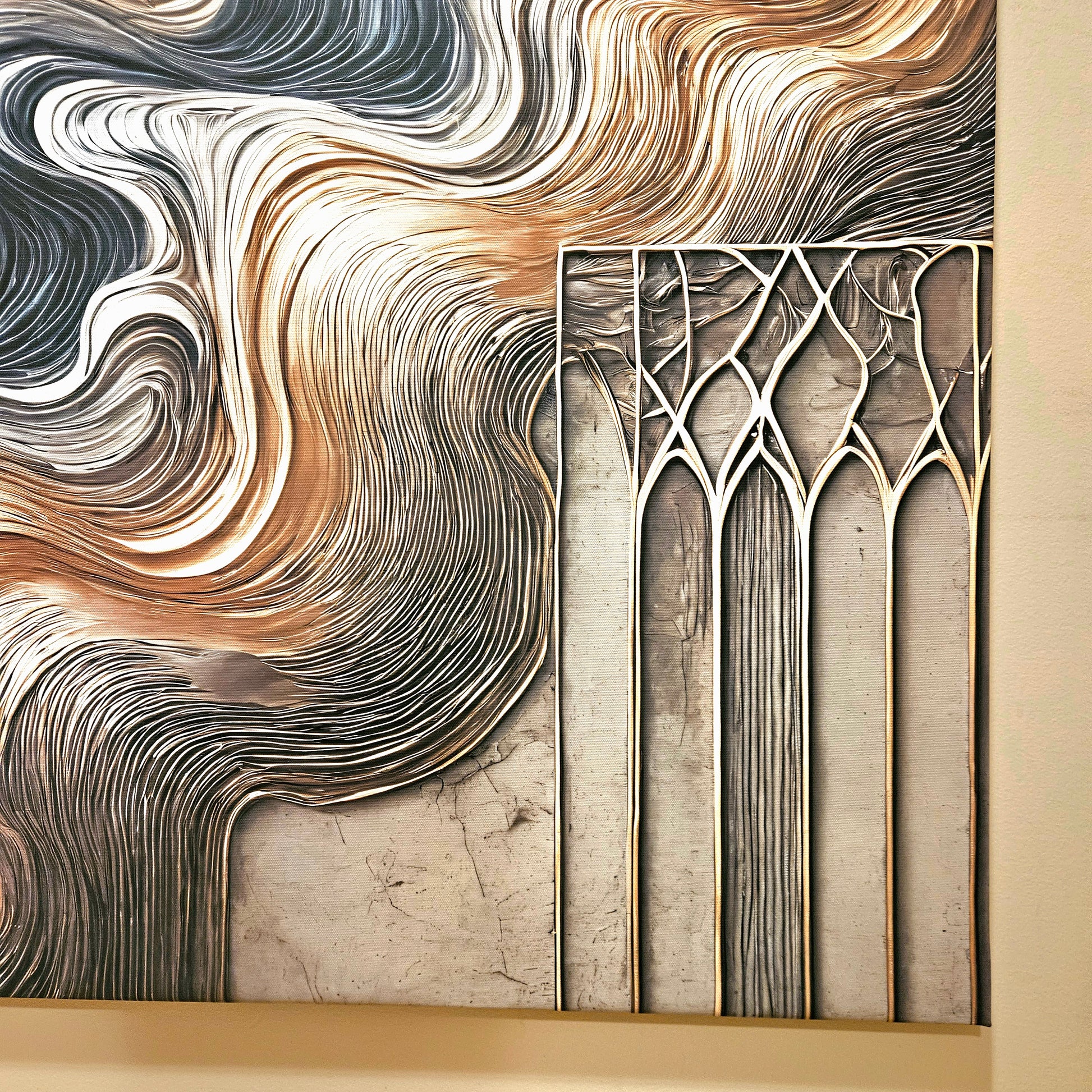 Discover the captivating interplay of movement and structure in "Ethereal Flows", a harmonious blend of fluid forms and architectural precision. This piece evokes the timeless beauty of flowing textures in warm gold, deep greys, and soft neutrals, accented by intricate gothic-inspired frames that resemble gateways to another dimension. Its striking balance of soft curves and rigid geometry creates a mesmerizing focal point for any sophisticated interior.