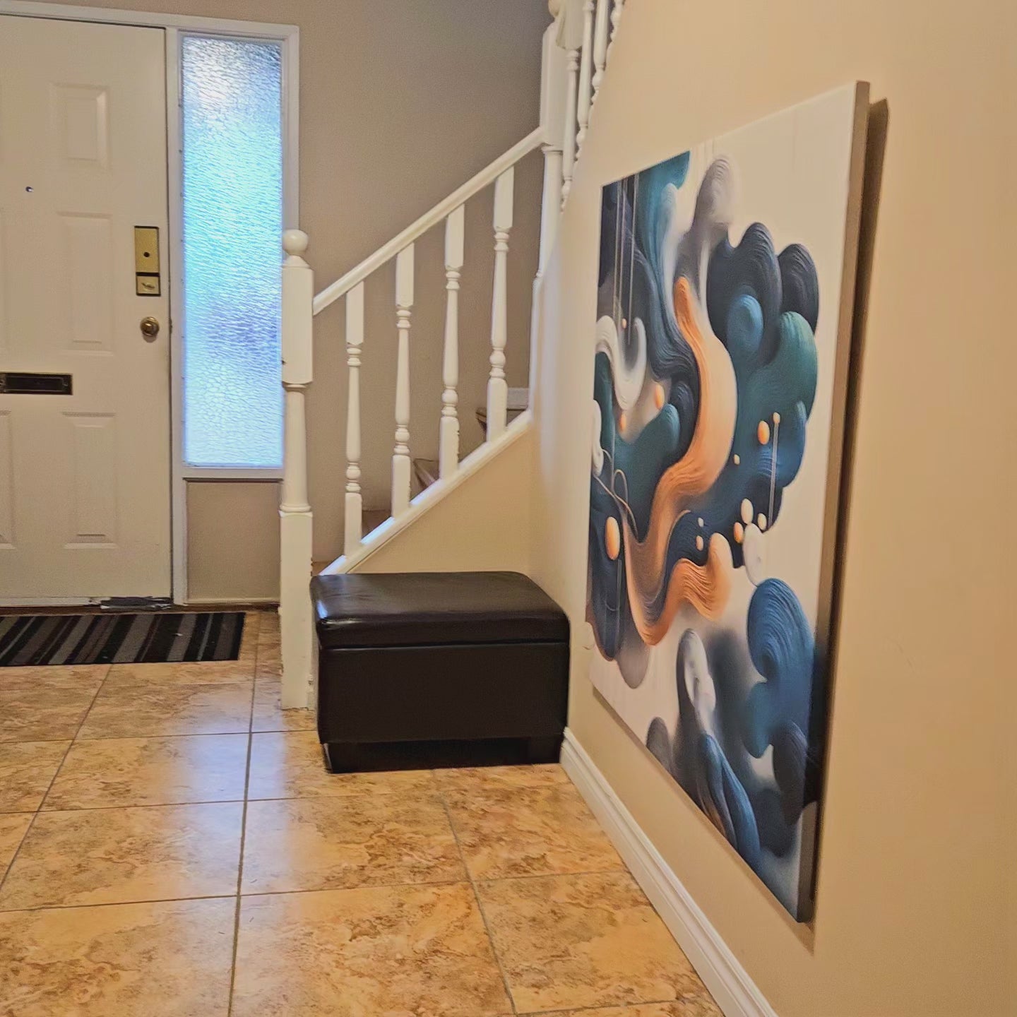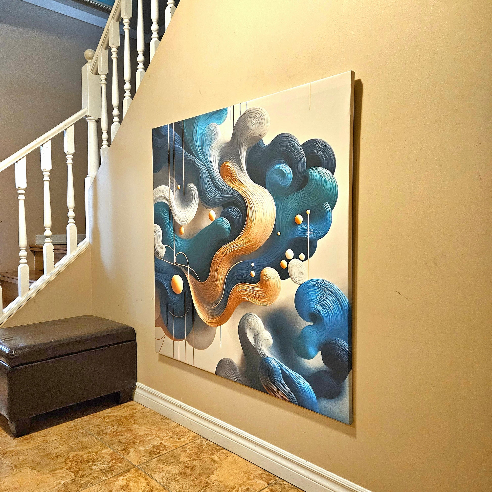 Dive into the enchanting motion of "Ethereal Waves," a dynamic abstract artwork that blends vibrant teal, gold, and deep blue tones with soft, swirling textures. This luxurious painting captures the fluidity of nature’s elements, evoking a sense of energy, calm, and elegance. Accents of shimmering gold add depth and sophistication, making this piece a perfect centerpiece for modern, minimalist, or contemporary interiors.