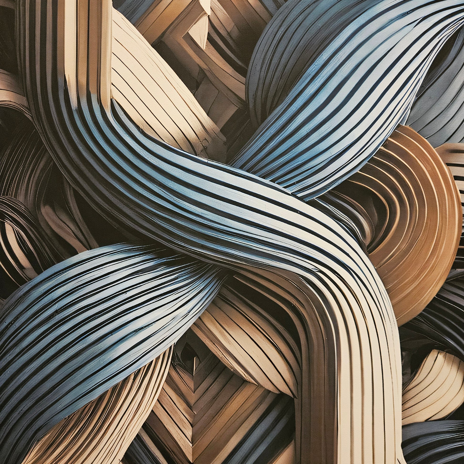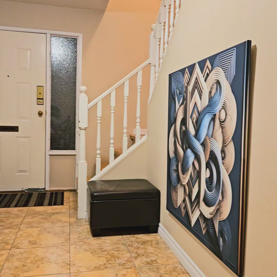 Unveil the mesmerizing complexity of "Flowing Geometry," an abstract artwork that intertwines flowing curves and bold geometric patterns. With its sophisticated palette of navy, beige, and gold, this piece effortlessly bridges natural forms with architectural precision. Designed to enhance modern interiors, this striking artwork brings depth, texture, and refined elegance to any space.