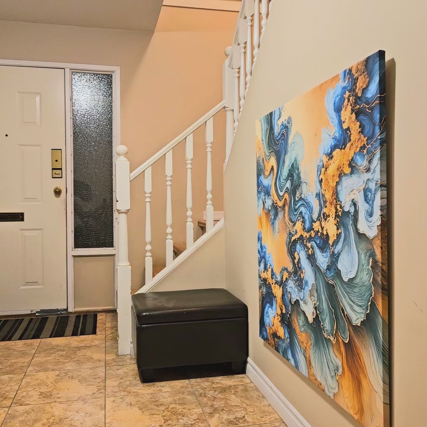 Elevate your space with "Golden Cascade," an enchanting abstract composition blending the shimmering tones of gold, blue, and green into a visual masterpiece. The flowing forms and intricate details evoke a sense of serenity and sophistication, making it the perfect addition to your home or office decor.