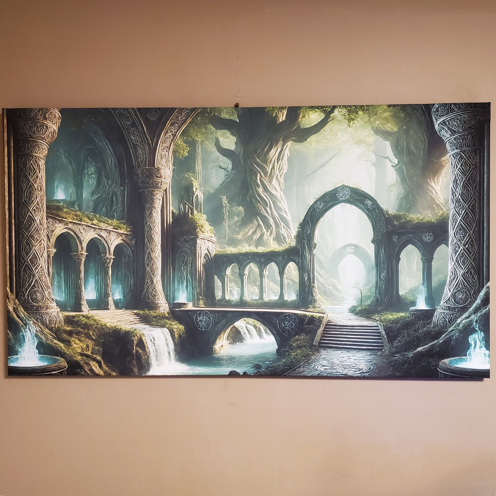 Surrounded by sacred trees and etched elven pillars, this piece invites you to pause, breathe, and cross into a world untouched by time. Perfect for meditation spaces, peaceful interiors, and those drawn to mystical and spiritual landscapes.