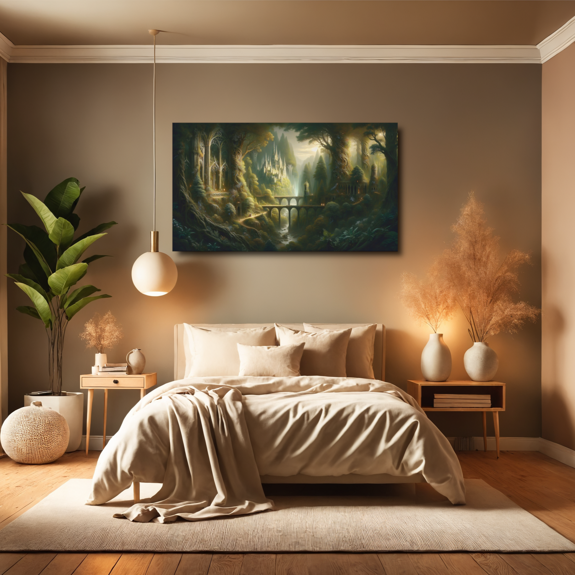Hidden deep within a valley of light and shadow stands "Eldergrove Citadel" — a towering sanctuary built among ancient trees, golden spires, and endless bridges. Mist flows through forest arches, and distant towers shimmer in the dawn glow, as if the citadel itself is breathing with life.