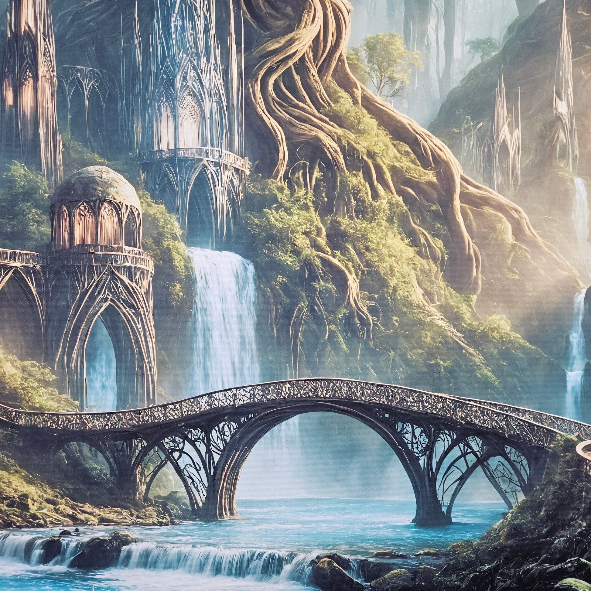 Step into Luminara Fallsong, a radiant elven sanctuary where glowing spires rise from ancient roots and shimmering waterfalls cascade into turquoise pools. Twisted tree trunks tower above the realm, their branches spreading light across moss-covered terraces and graceful bridges. Warm lanterns glow from the carved stone halls, giving the entire scene a sense of timeless magic and celestial harmony.