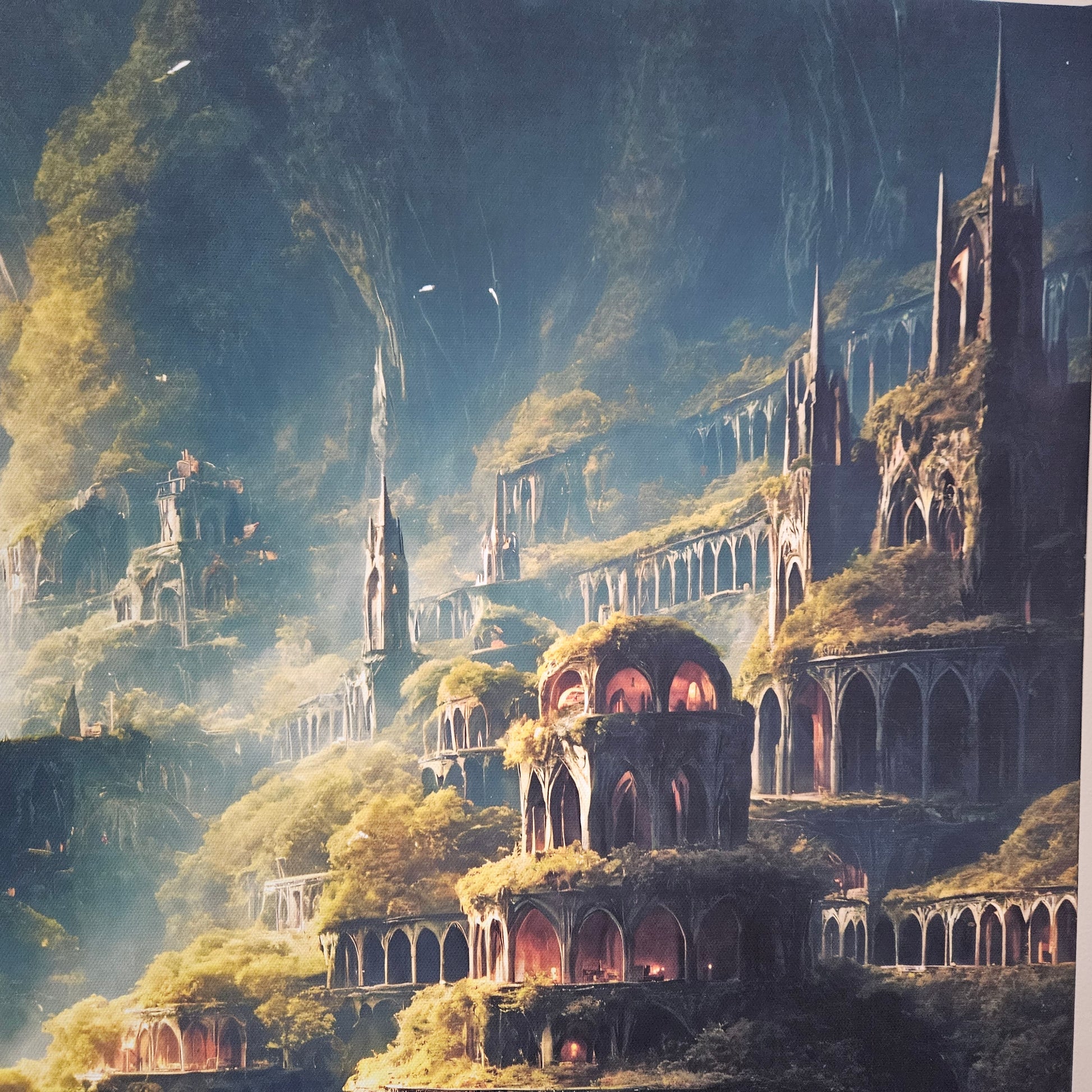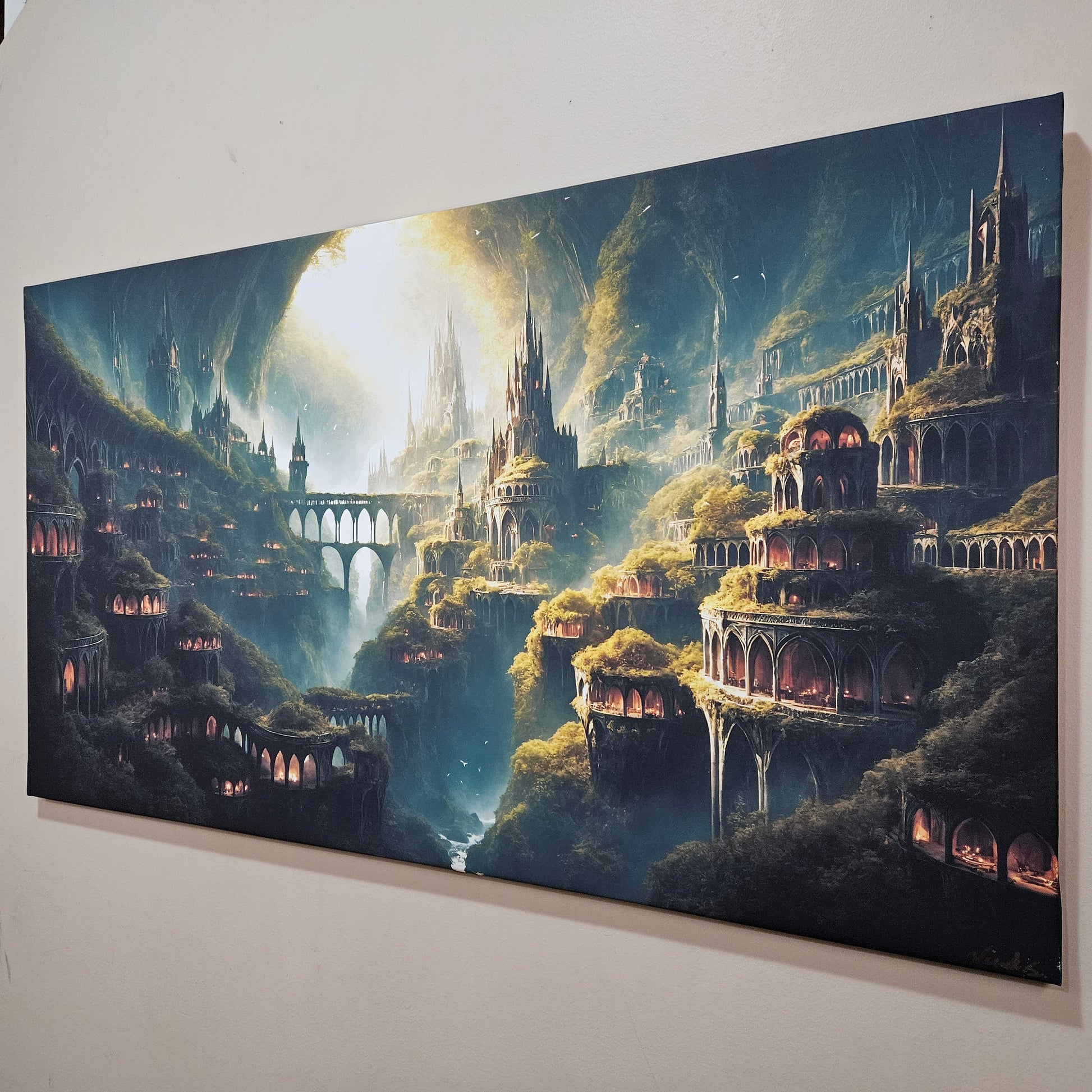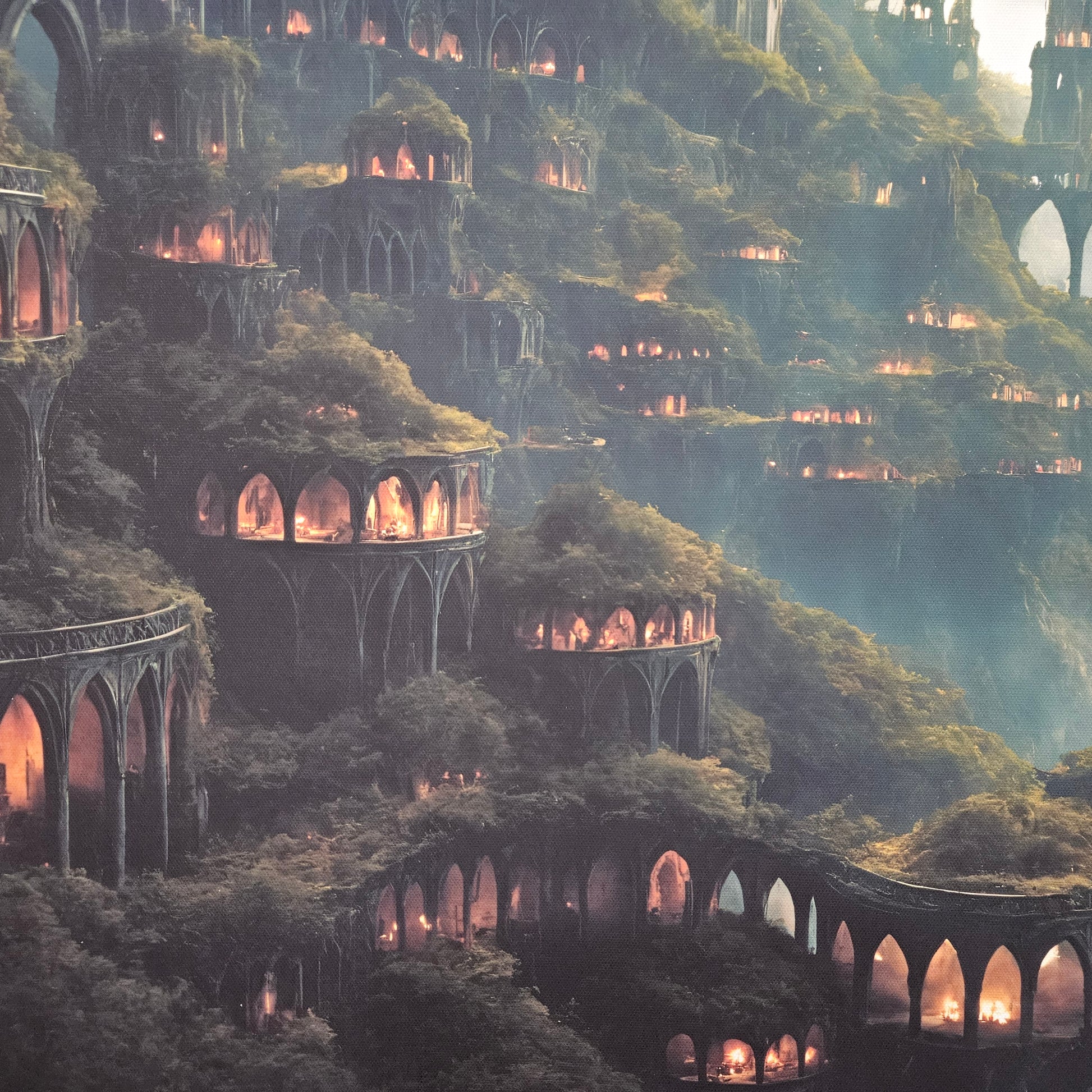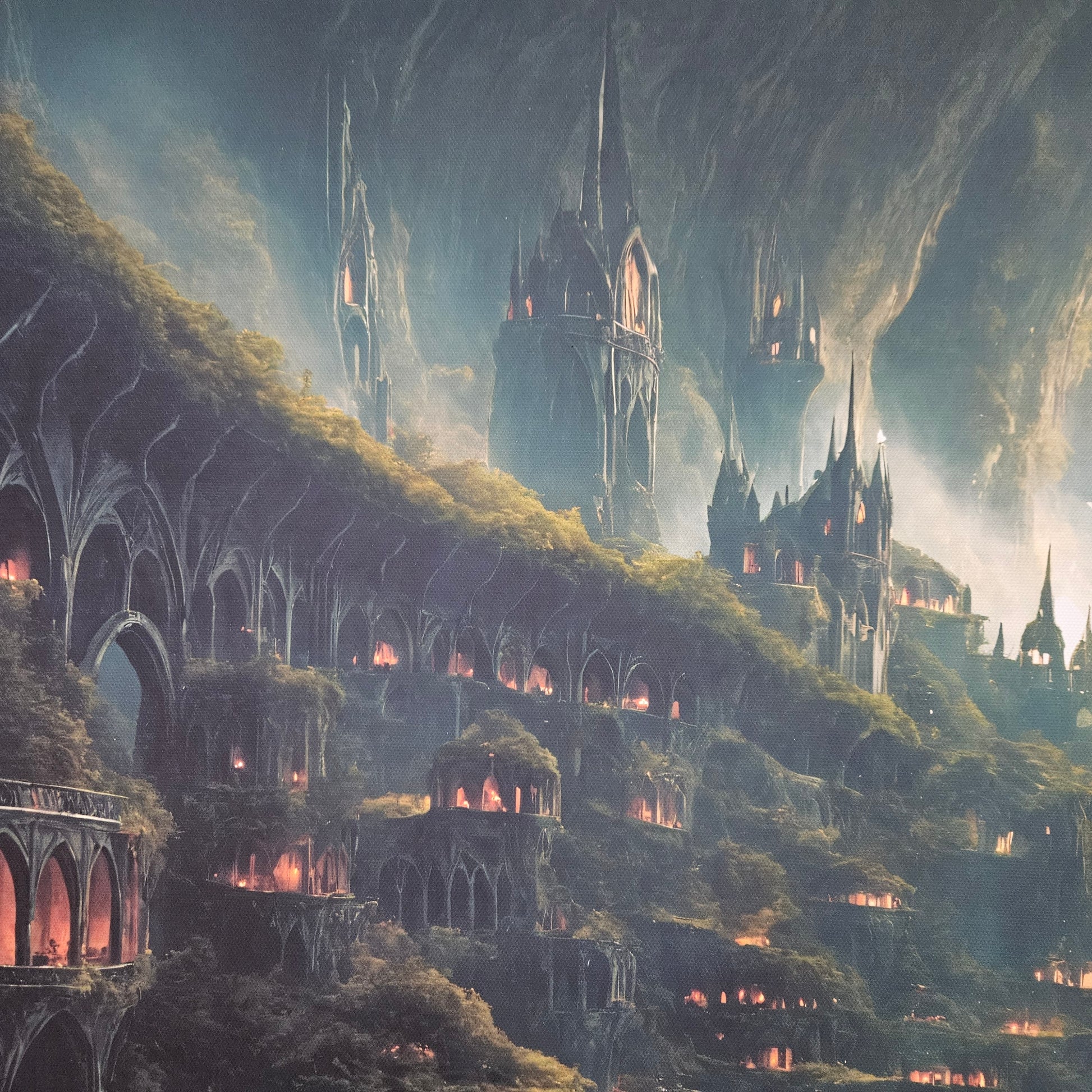 This piece is both majestic and inviting — ideal for those drawn to hidden worlds, earth-toned architecture, and mystical realms where nature and civilization live as one.