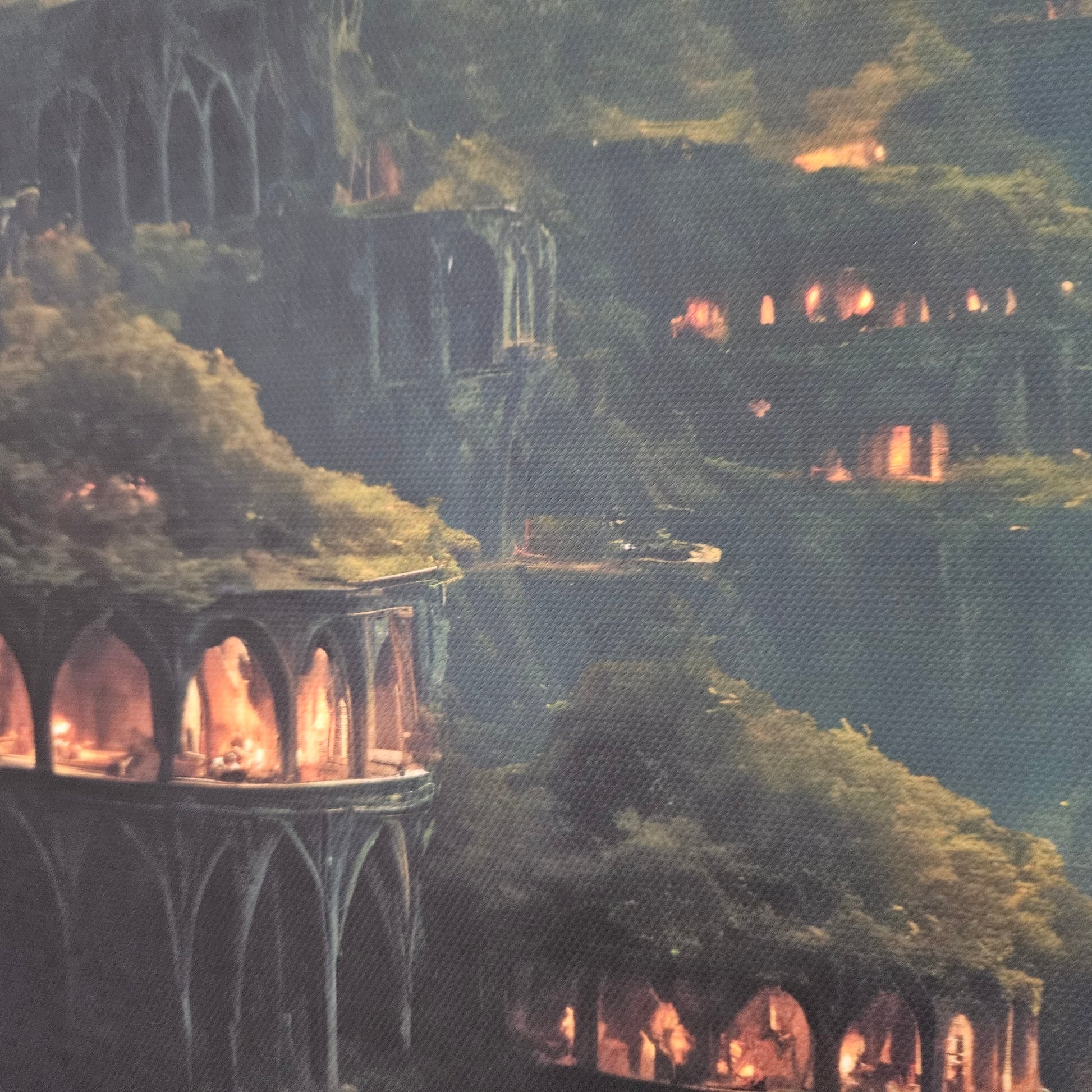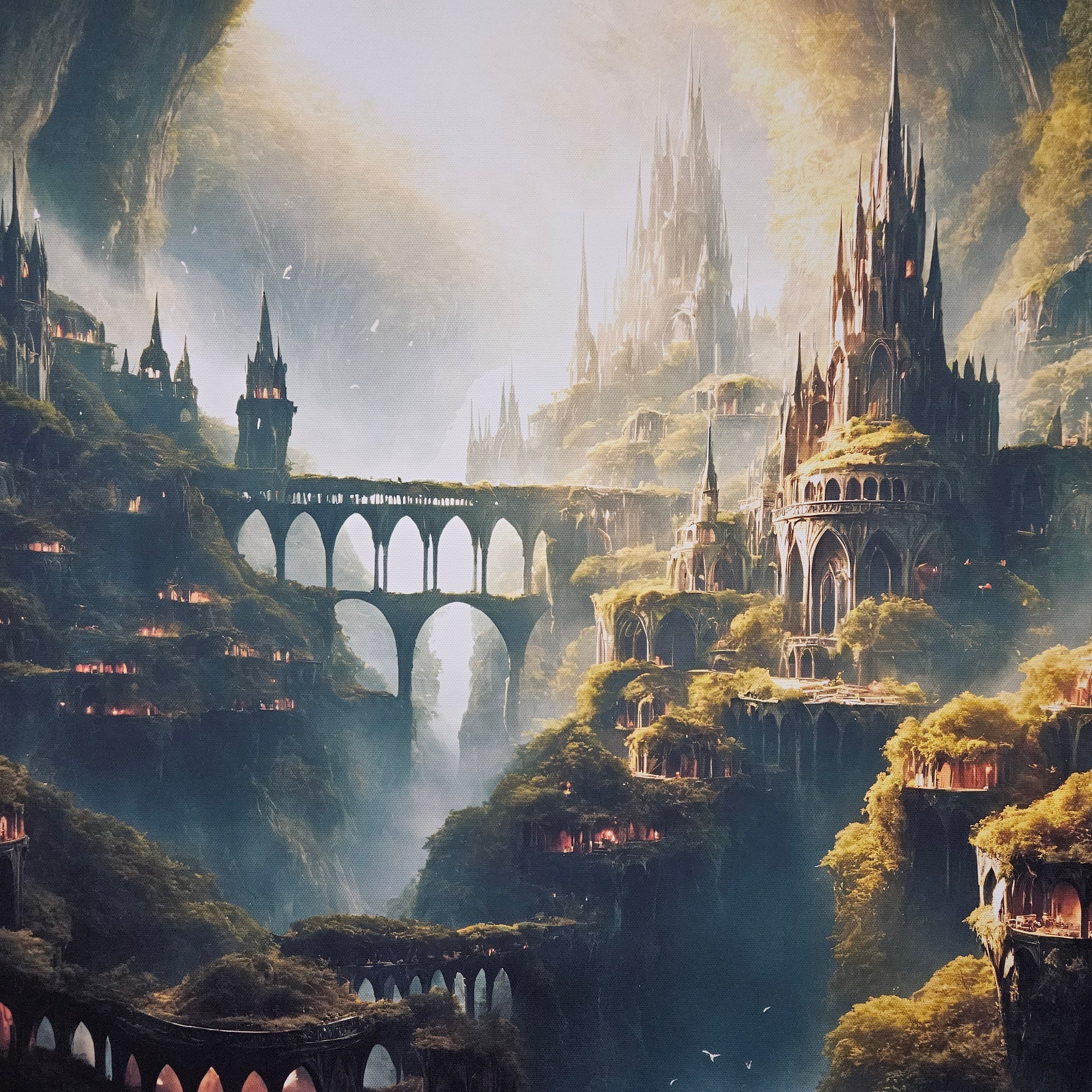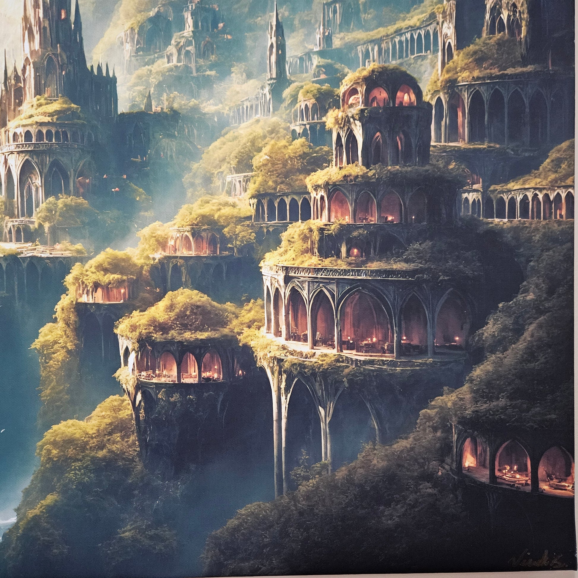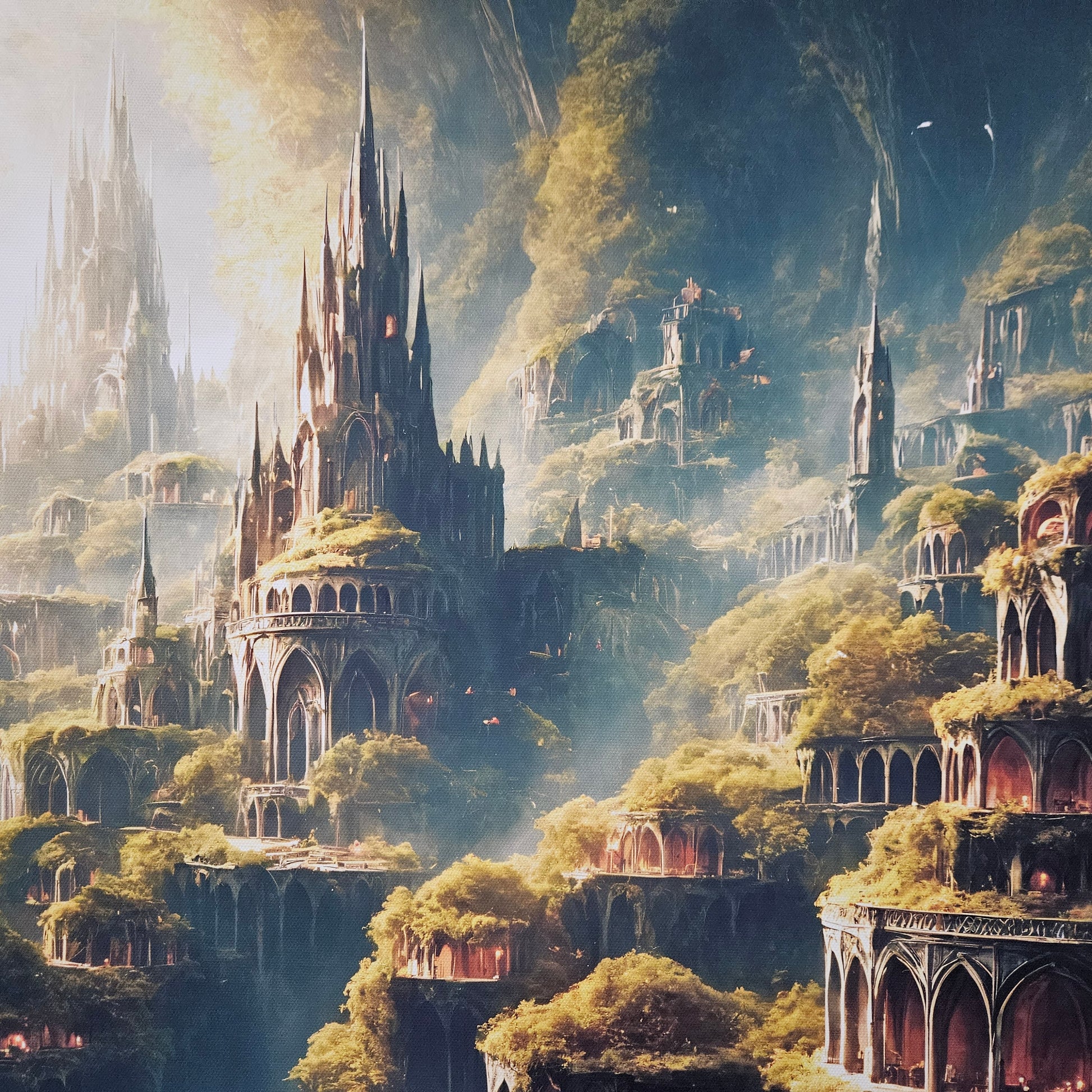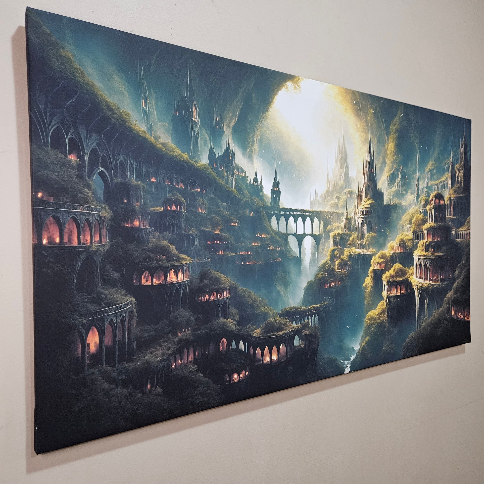 This piece is both majestic and inviting — ideal for those drawn to hidden worlds, earth-toned architecture, and mystical realms where nature and civilization live as one.