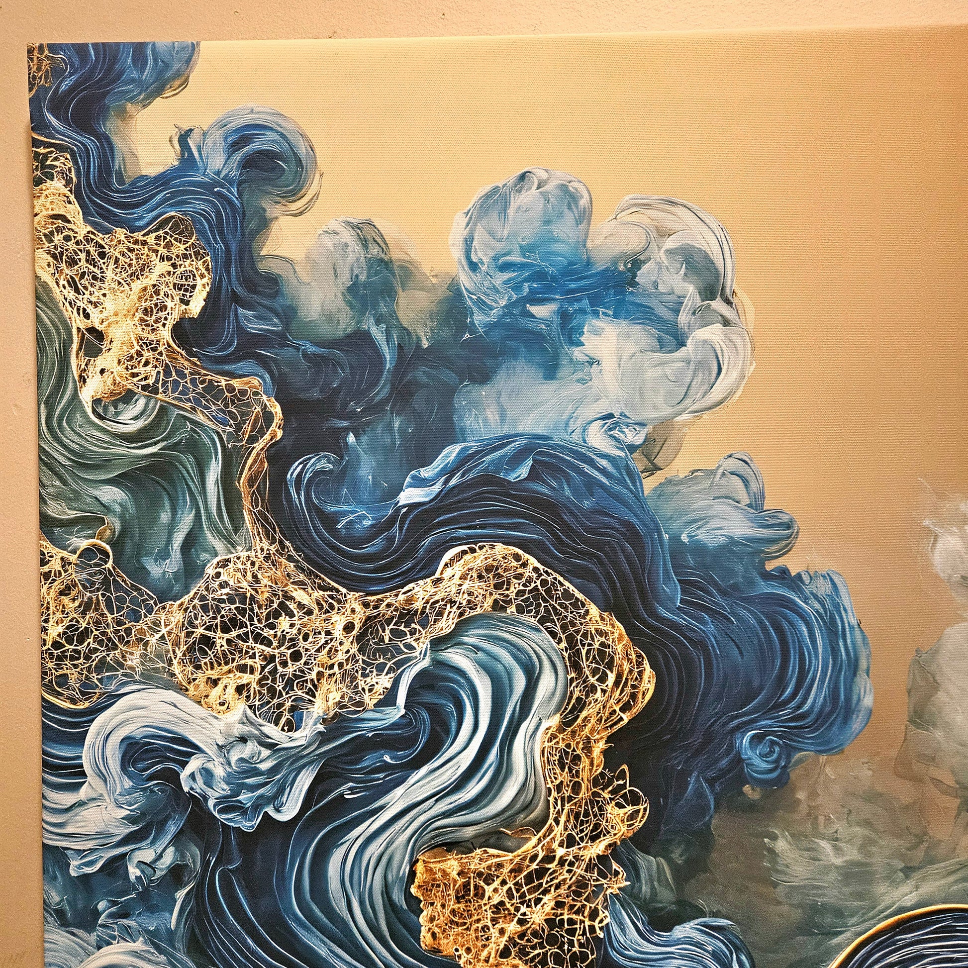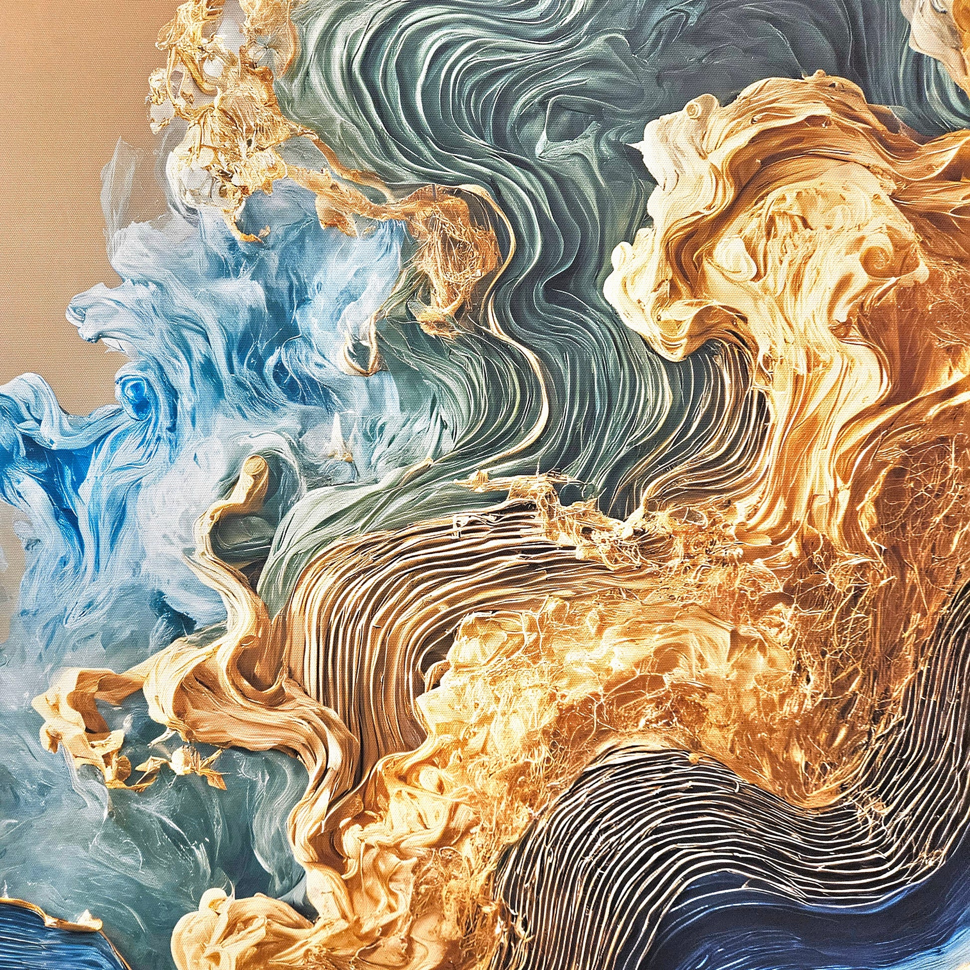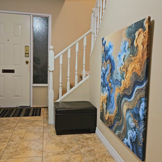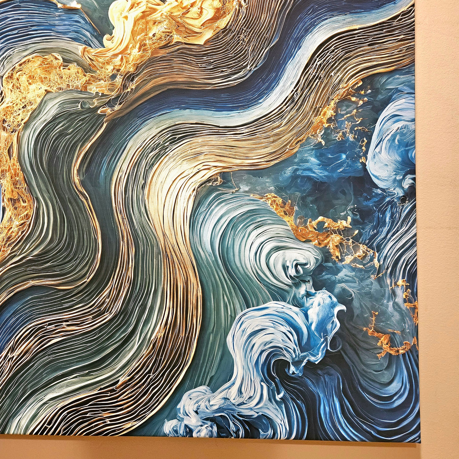 Dive into the fluid elegance of "Oceanic Harmony," an abstract masterpiece that captures the rhythm and beauty of ocean waves. Featuring a mesmerizing palette of blue, gold, and teal, this artwork blends dynamic motion with serene design, evoking a sense of tranquility and depth. Perfect for modern interiors, this piece brings life and sophistication to living spaces, offices, or creative environments.