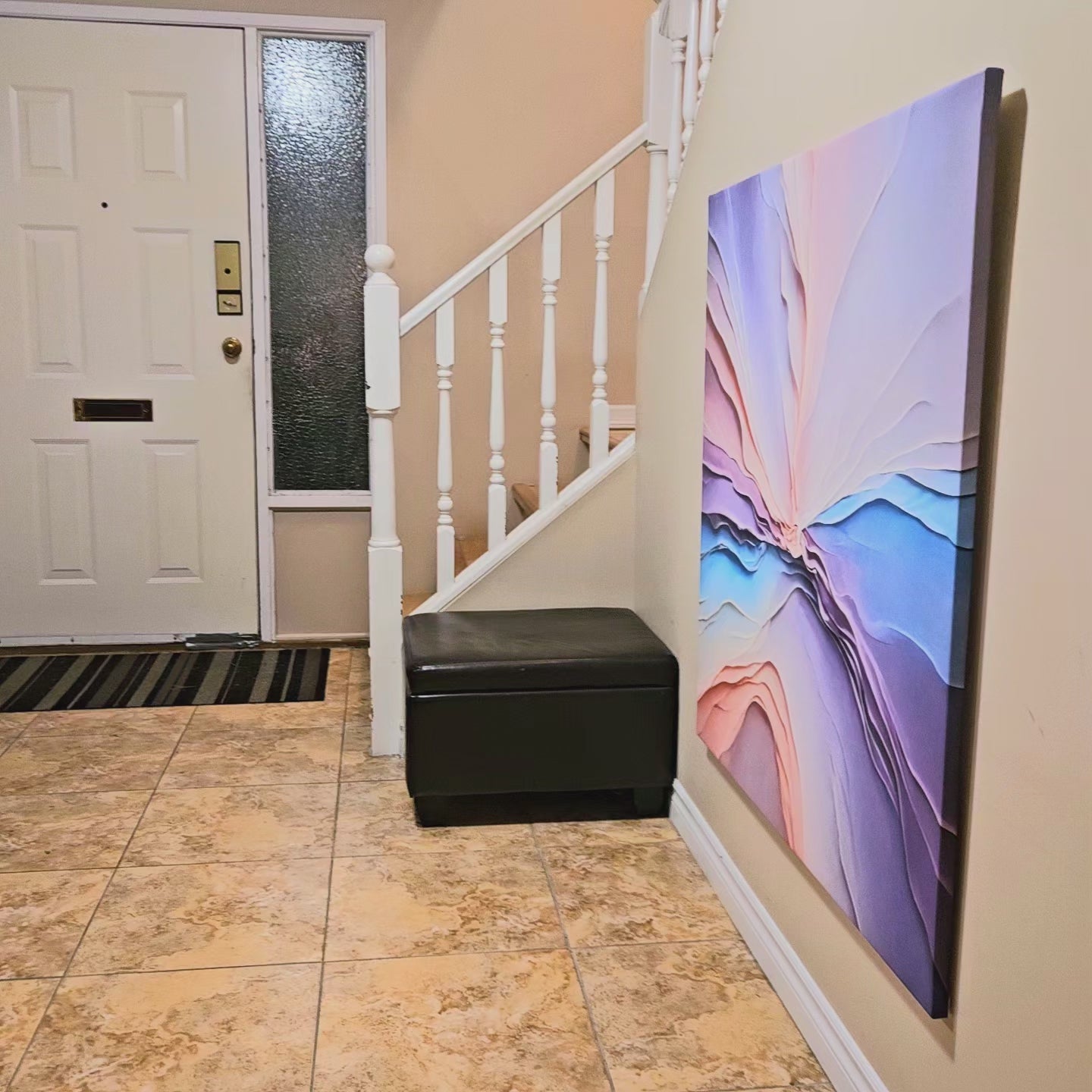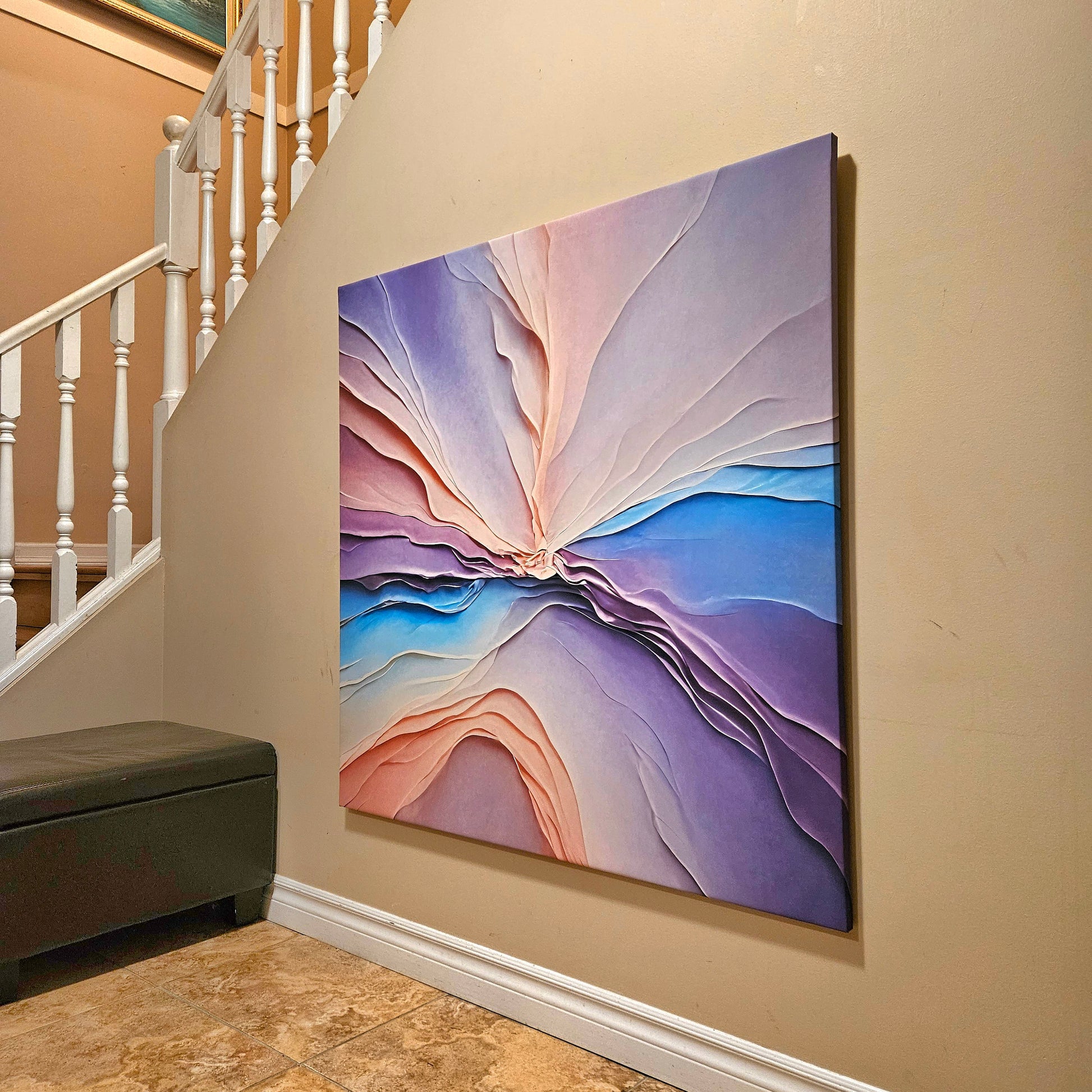 "Pastel Bloom" is a gentle yet captivating artwork that merges the serene beauty of pastel tones. With delicate shades of pink, lavender, and light blue, this piece offers a soothing presence, embodying tranquility and grace. Its layered texture gives depth and movement, making it a statement of elegance and serenity.