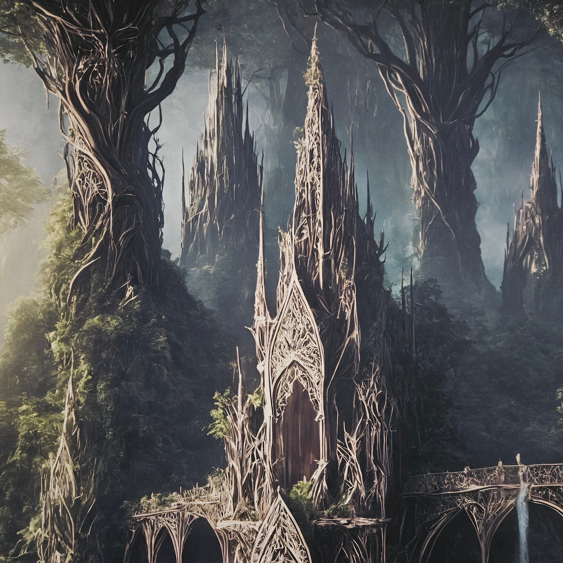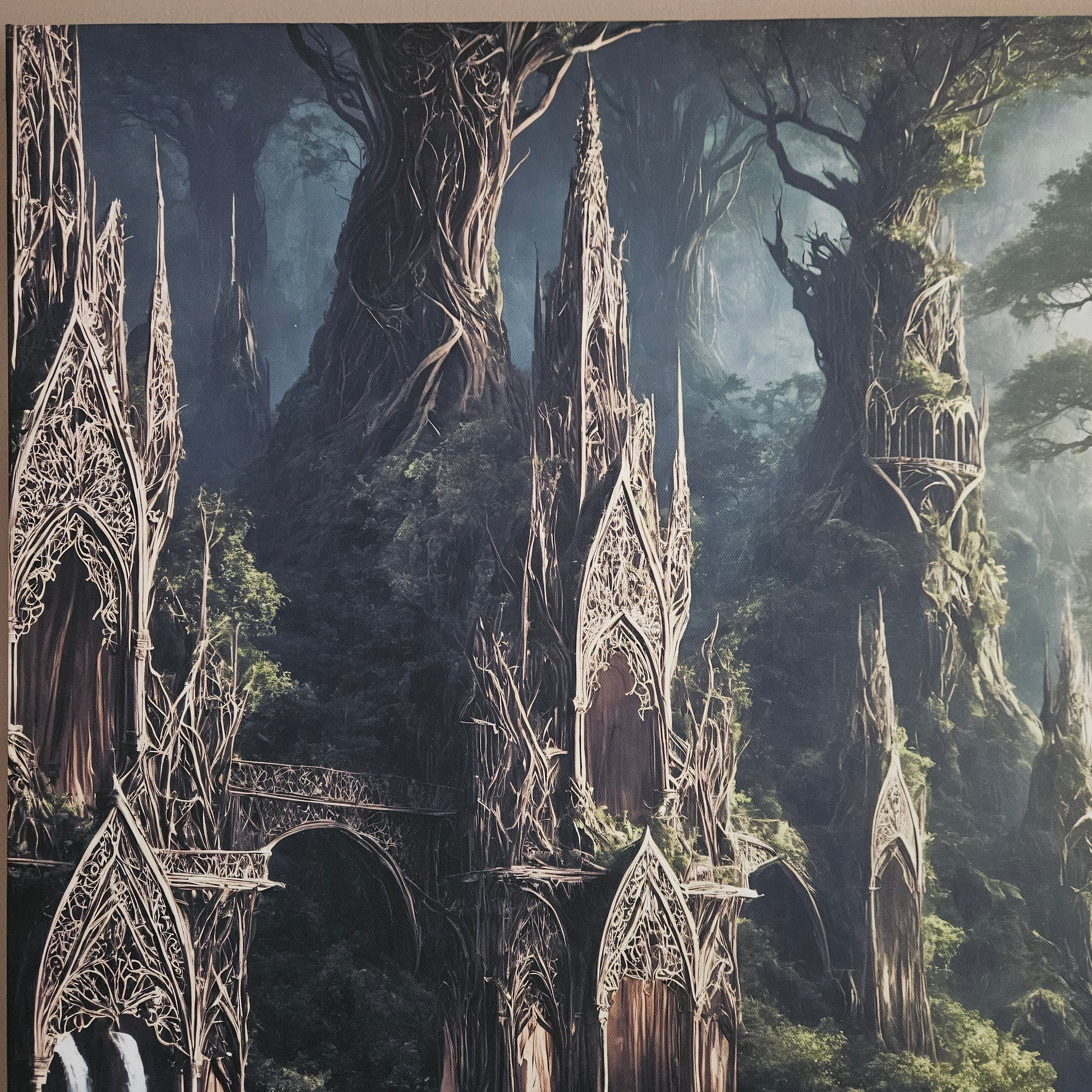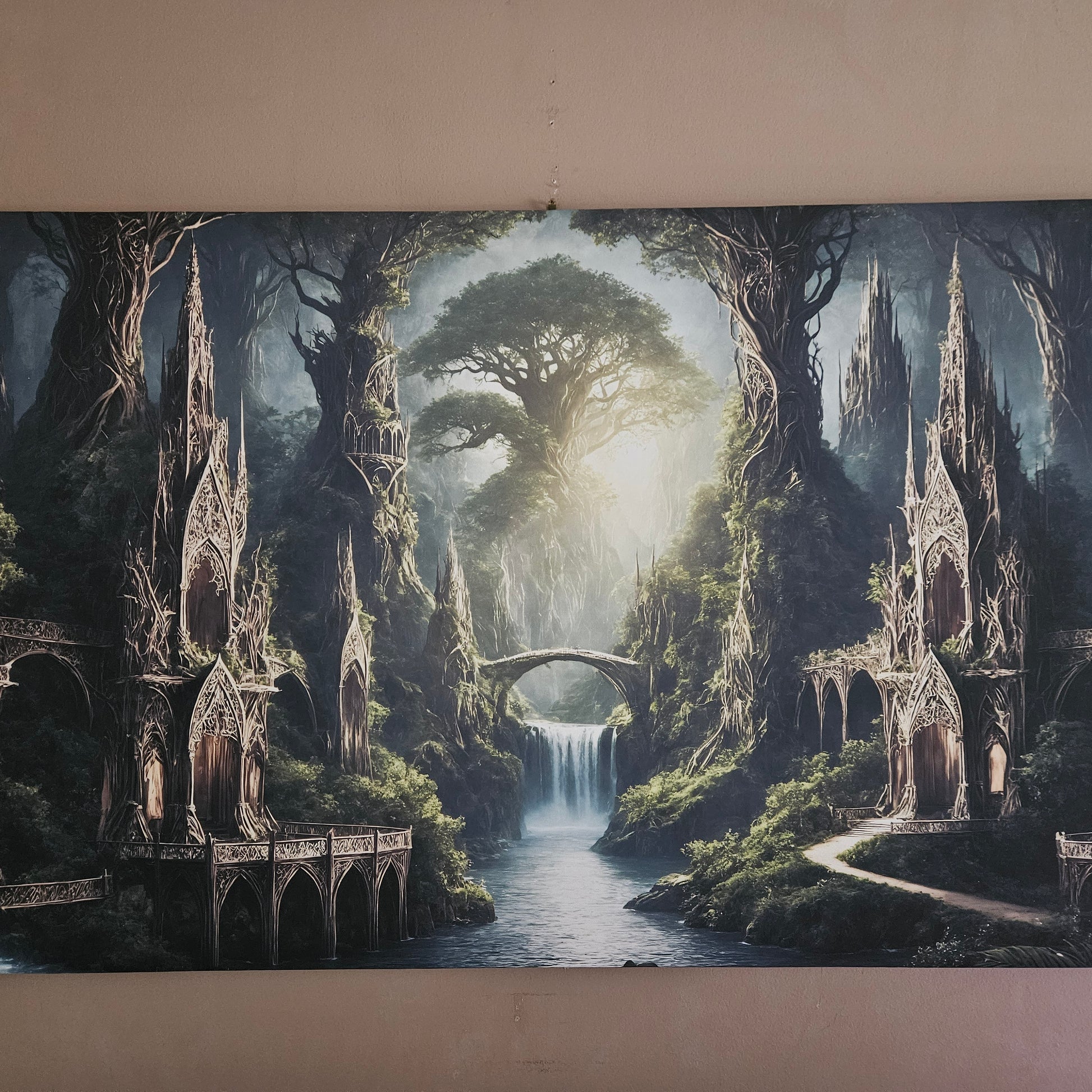 Find serenity in the heart of the forest with "Rivendell Oasis." Inspired by ancient elven sanctuaries and the gentle flow of nature, this radiant landscape features luminous towers, cascading waterfalls, and a sacred tree glowing at the center of a peaceful valley.