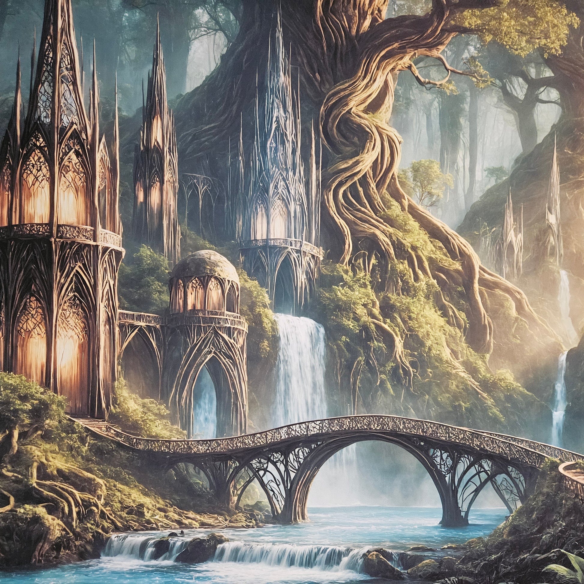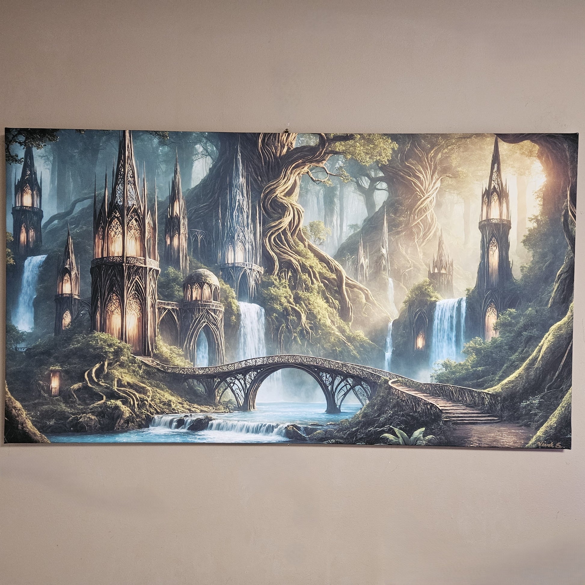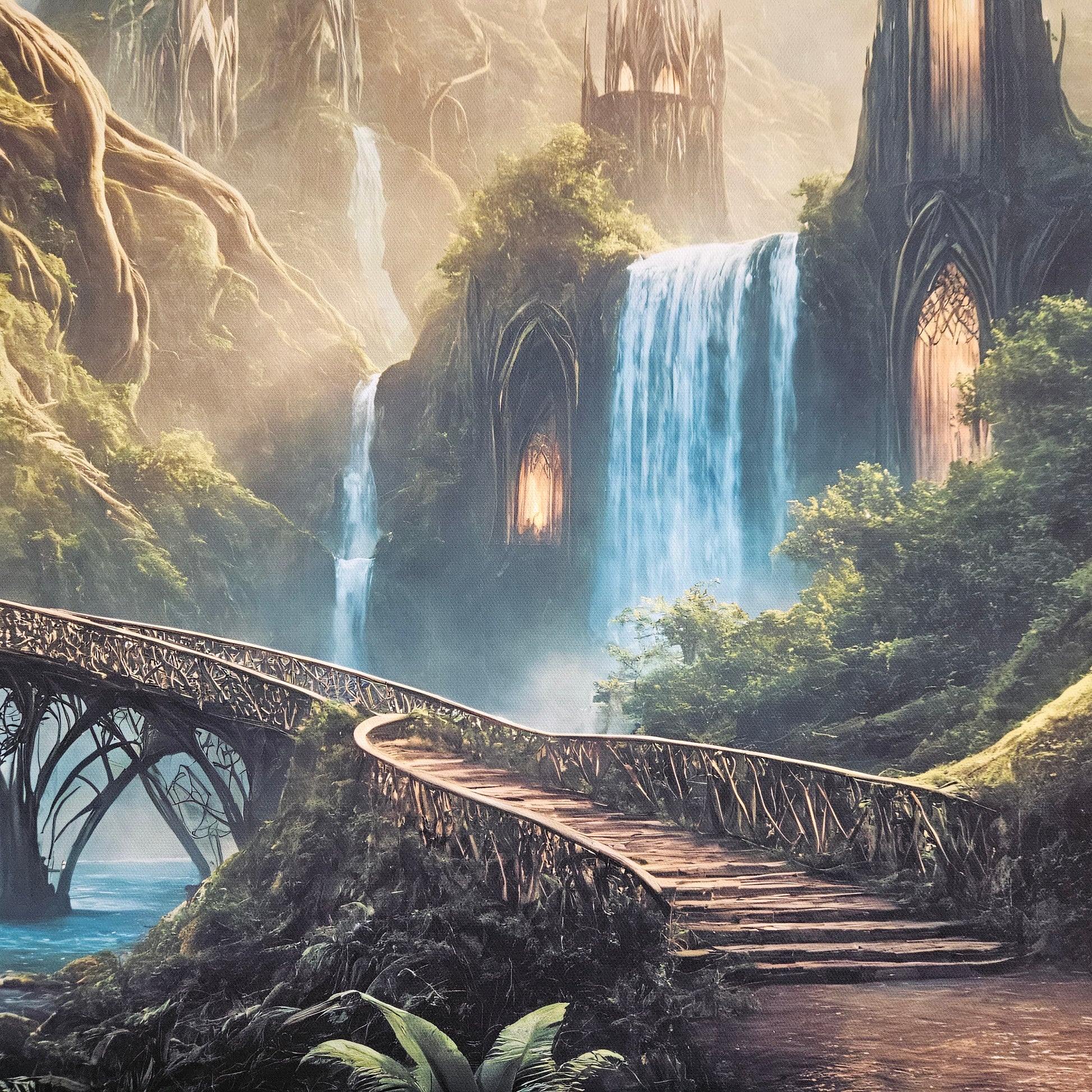 Step into a world untouched by time — "Sanctuary of the Ancients" is a breathtaking elven cityscape nestled within ancient forests and cascading waterfalls. Inspired by the magic of Rivendell and the grandeur of nature’s harmony, this artwork evokes peace, mystery, and enchantment.