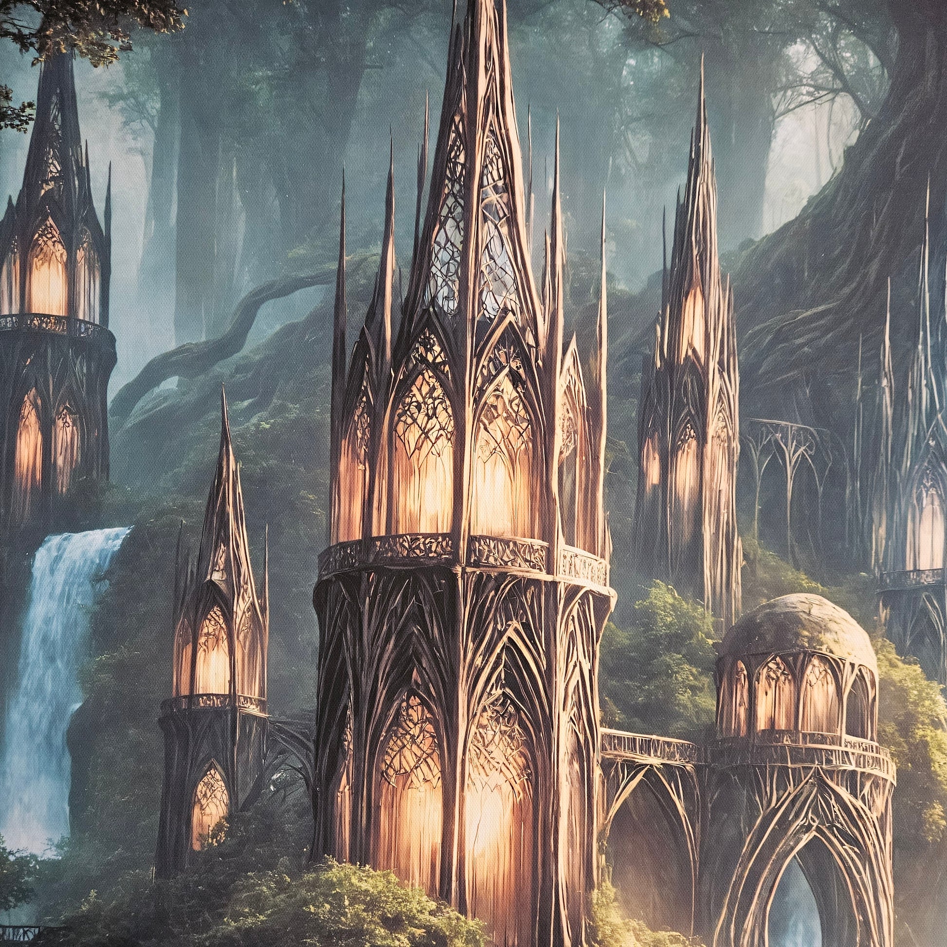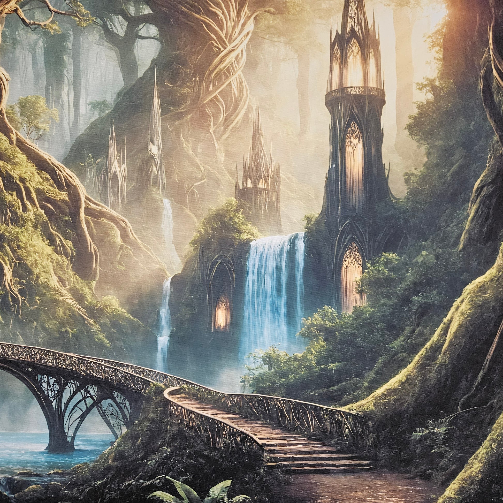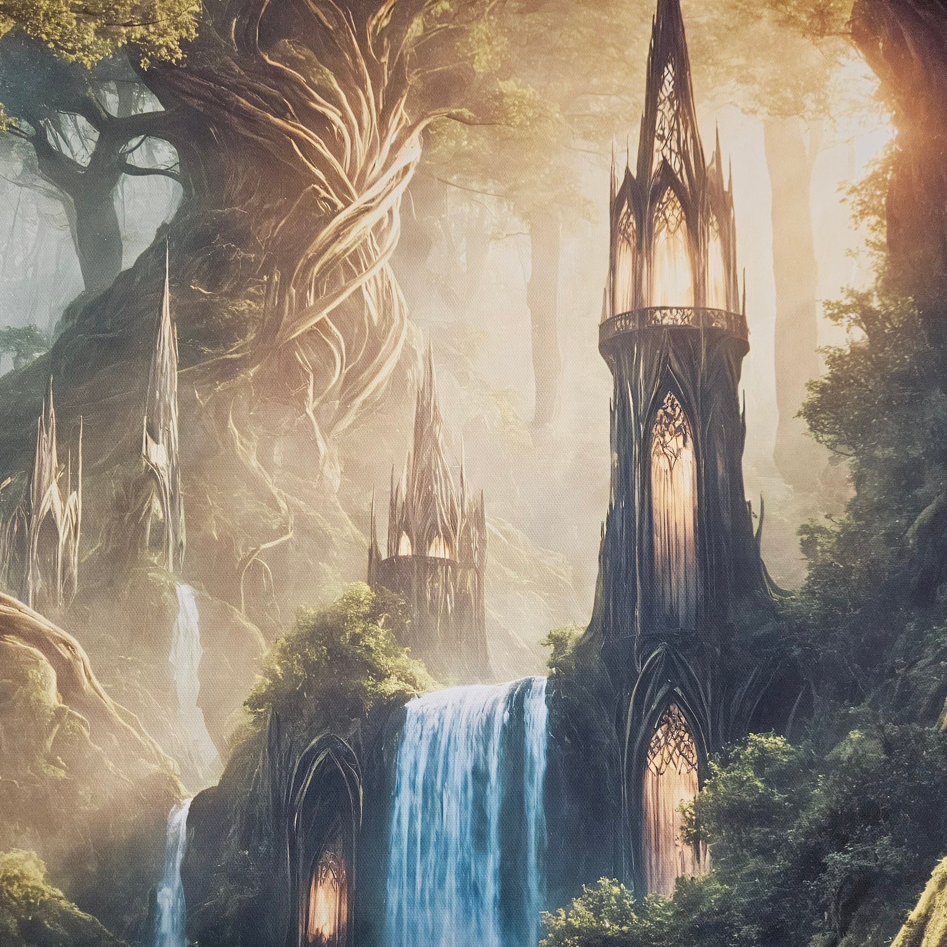 Step into a world untouched by time — "Sanctuary of the Ancients" is a breathtaking elven cityscape nestled within ancient forests and cascading waterfalls. Inspired by the magic of Rivendell and the grandeur of nature’s harmony, this artwork evokes peace, mystery, and enchantment.