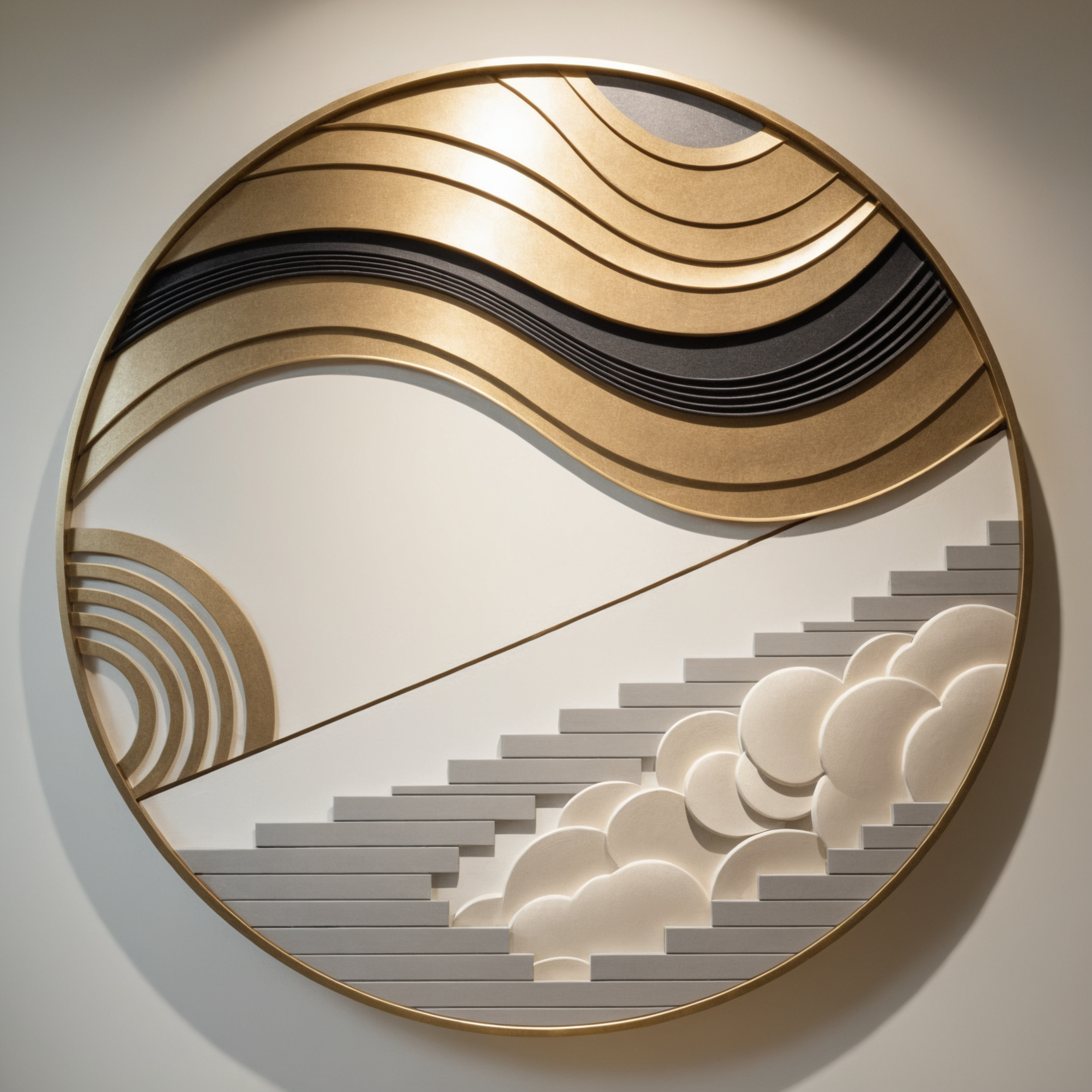Where the Light Leads captures a sense of gentle direction and calm momentum. Soft steps rise through layered forms, guided by flowing gold lines that suggest movement toward clarity and ease. The piece feels open and optimistic, bringing lightness into a space without overpowering it. It’s an artwork that invites calm progress and a quiet sense of possibility.